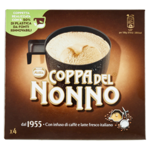 Il Piacere del Caffè Un'antica ricetta trasforma i grani di caffè verde ancora grezzi in chicchi tostati e macinati, per creare un infuso dall'aroma intenso. Unico e Inimitabile Un marchio senza tempo, amato da tutti. Dietro ad ogni cucchiaino c'è il sapore della tradizione. Verso una coppa più sostenibile Coppa del Nonno utilizza plastica certificata ISCC Mass Balance. Questo contribuisce a ridurre l'uso di materie prime fossili e promuove l'utilizzo di risorse prodotte in modo sostenibile. Scopri di più su: www.ISCC-system.org - La coppa più amata** da oggi più Sostenibile! - Dal 1955 - Con infuso di caffè e latte fresco italiano - x4 - 4 Porzioni - **Fonte: IRI, I+S+LSP+Discount, Vendite a Valore Coppe Multipack, FY 2020