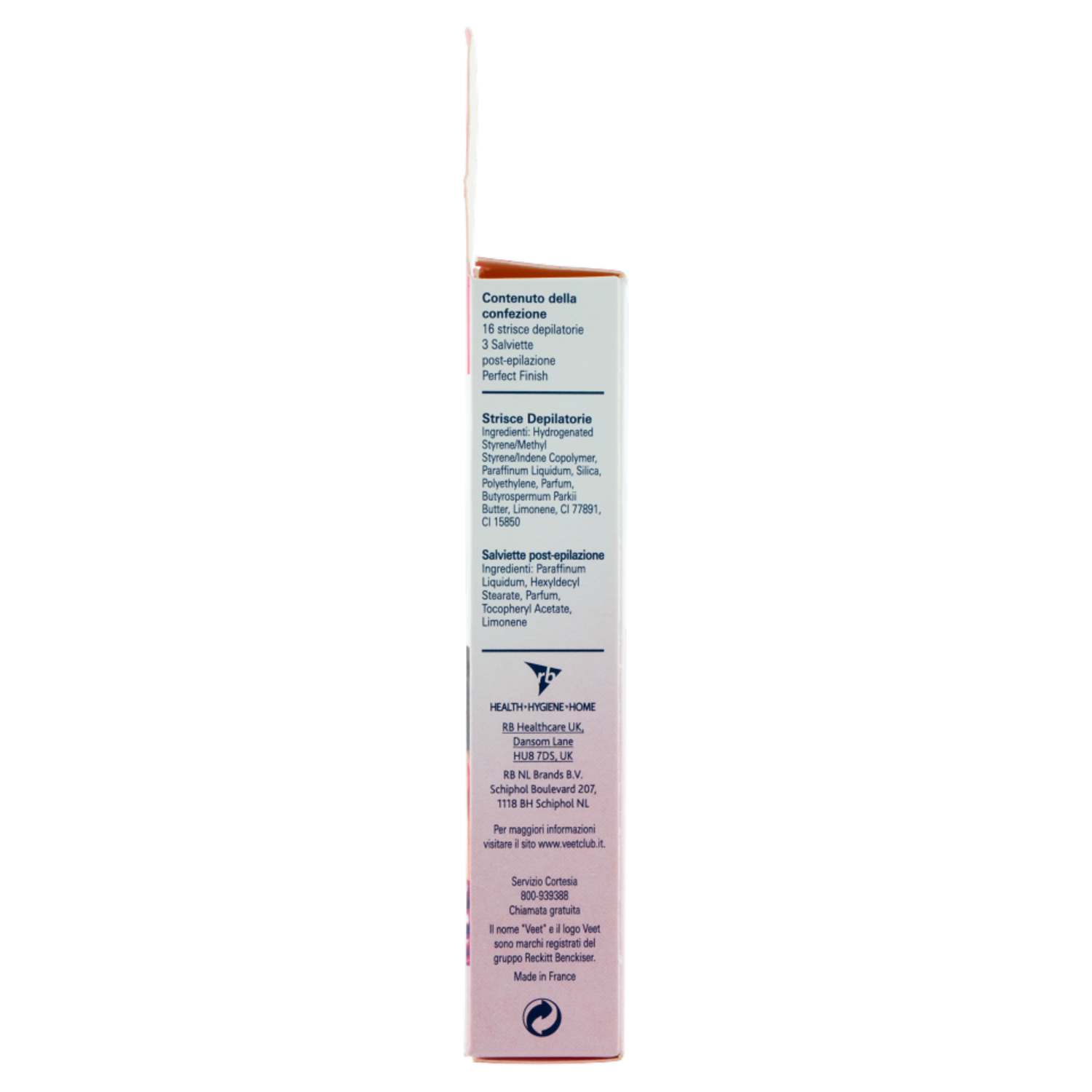 Precauzioni d'uso - Conservare la confezione esterna. Leggere attentamente e seguire tutte le precauzioni e le istruzioni d'uso prima dell'utilizzo - Adatte all'uso su labbro superiore, guance e mento - NON ADATTE all'uso su altre zone del viso, testa, orecchie, zone perianali, genitali e capezzoli o su qualsiasi altra parte del corpo. - Non utilizzare su herpes labiale, vene varicose, cicatrici, nei, brufoli, lesioni, irritazioni, scottature, su pelli che in passato abbiano evidenziato una reazione allergica alla cera. Attendere 72 ore tra una depilazione e l'altra. - Consultare il proprio medico prima dell'uso se si stanno assumendo medicinali che possono avere effetti sulla pelle o se si soffre di disturbi legati alla pelle. - L'uso delle cere depilatorie non è indicato per persone anziane, diabetiche o che assumono retinoidi orali. - Se il prodotto non è mai stato utilizzato prima, si consiglia di iniziare rimuovendo i peli delle gambe. Solo dopo aver acquisito esperienza passare alle zone sensibili del viso. - Prima dell'uso, assicurarsi che la pelle sia asciutta, non irritata e priva di creme, olii o deodoranti. - Prima di ogni depilazione, VERIFICARE LA REAZIONE DELLA PELLE applicando la cera su una piccola parte della zona che si desidera trattare, seguendo le istruzioni per l'uso. Se dopo 24 ORE non si evidenziano reazioni avverse, procedere con l'applicazione. - Se si avvertono sensazioni di bruciore/pizzicore durante l'uso, rimuovere subito la cera con il retro di una striscia usata, una salvietta post-epilazione o dell'olio per bambini, quindi risciacquare abbondantemente con acqua fredda. Se la sensazione di bruciore persiste, consultare un medico. - Non applicare la cera più di una volta sulla stessa area. - Dopo l'uso, la pelle può risultare più sensibile per un breve periodo, quindi evitare di grattarsi. - Dopo la depilazione, si consiglia di attendere 24 ore prima di applicare qualsiasi prodotto profumato, di sottoporsi a trattamenti di abbronzatura artificiale, nuotare o esporsi al sole. - Se si terminano le salviette Perfect Finish, per rimuovere i residui di cera è possibile utilizzare dell'olio per bambini. Non utilizzare acqua, sapone o alcool per rimuovere la cera. - TENERE FUORI DALLA PORTATA DEI BAMBINI. - In caso di ingestione, consultare immediatamente un medico e mostrare la confezione. - Evitare il contatto con gli occhi. In caso di contatto con gli occhi, sciacquare immediatamente con abbondante acqua e consultare un medico. - La cera può essere utilizzata in gravidanza ma potrebbe causare la comparsa di lividi. - Conservare le strisce rimanenti in un luogo fresco e asciutto.