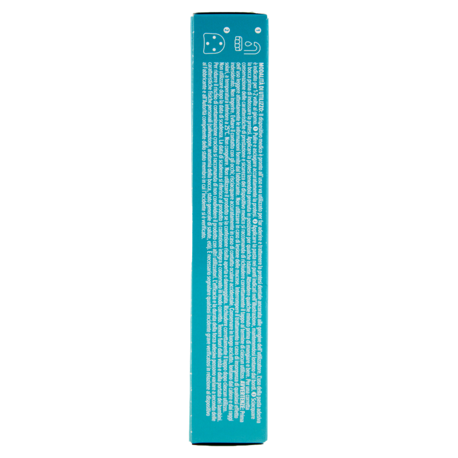 Indicazioni d'uso: Il dispositivo medico è indicato per far aderire e trattenere la protesi dentale ancorata alle gengive dell'utilizzatore. L'uso della pasta adesiva è indicato per 1-2 volte al giorno. Controindicazioni: Il dispositivo medico non è indicato per i soggetti con nota ipersensibilità ai componenti presenti nella formulazione. Modalità di utilizzo: Il dispositivo medico è pronto all'uso e va utilizzato per far aderire e trattenere la protesi dentale ancorata alle gengive dell'utilizzatore. L'uso della pasta adesiva è indicato per 1-2 volte al giorno. 1 Pulire e asciugare accuratamente la protesi. 2 Applicare la pasta nei punti indicati nell'illustrazione, mantenendosi lontano dai bordi. 3 Sciacquare la bocca prima di indossare la protesi. Applicare la protesi tenendola premuta in posizione per qualche istante. Attendere qualche minuto prima di mangiare e bere. Per una corretta conservazione delle caratteristiche di prestazione e sicurezza del dispositivo medico si raccomanda di richiudere correttamente il tappo al termine di ciascun utilizzo.