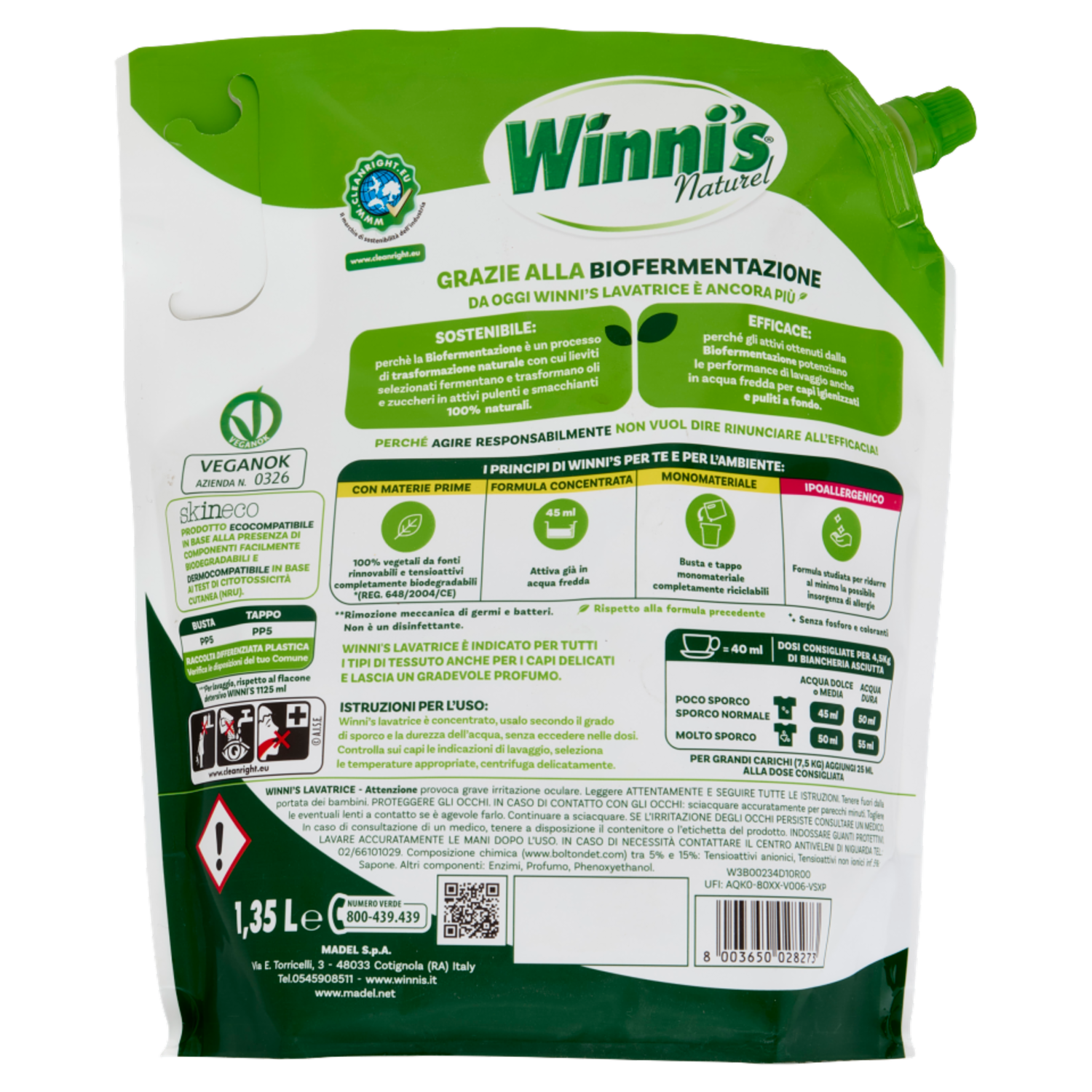 Grazie alla Biofermentazione da oggi Winni's lavatrice è ancora più* Sostenibile: perchè la Biofermentazione è un processo di trasformazione naturale con cui lieviti selezionati fermentano e trasformano oli e zuccheri in attivi pulenti e smacchianti 100% naturali. Efficace: perché gli attivi ottenuti dalla Biofermentazione potenziano le performance di lavaggio anche in acqua fredda per capi igienizzati e puliti a fondo. * Rispetto alla formula precedente Perché agire responsabilmente non vuol dire rinunciare all'efficacia! I principi di Winni's per te e per l'ambiente: Con materie prime 100% vegetali da fonti rinnovabili e tensioattivi completamente biodegradabili *(REG. 648/2004/CE) Formula concentrata 45 ml - Attiva già in acqua fredda Monomateriale Busta e tappo monomateriale completamente riciclabili Ipoallergenico Formula studiata per ridurre al minimo la possibile insorgenza di allergie Senza fosforo e coloranti Winni's Lavatrice è indicato per tutti i tipi di tessuto anche per i capi delicati e lascia un gradevole profumo.