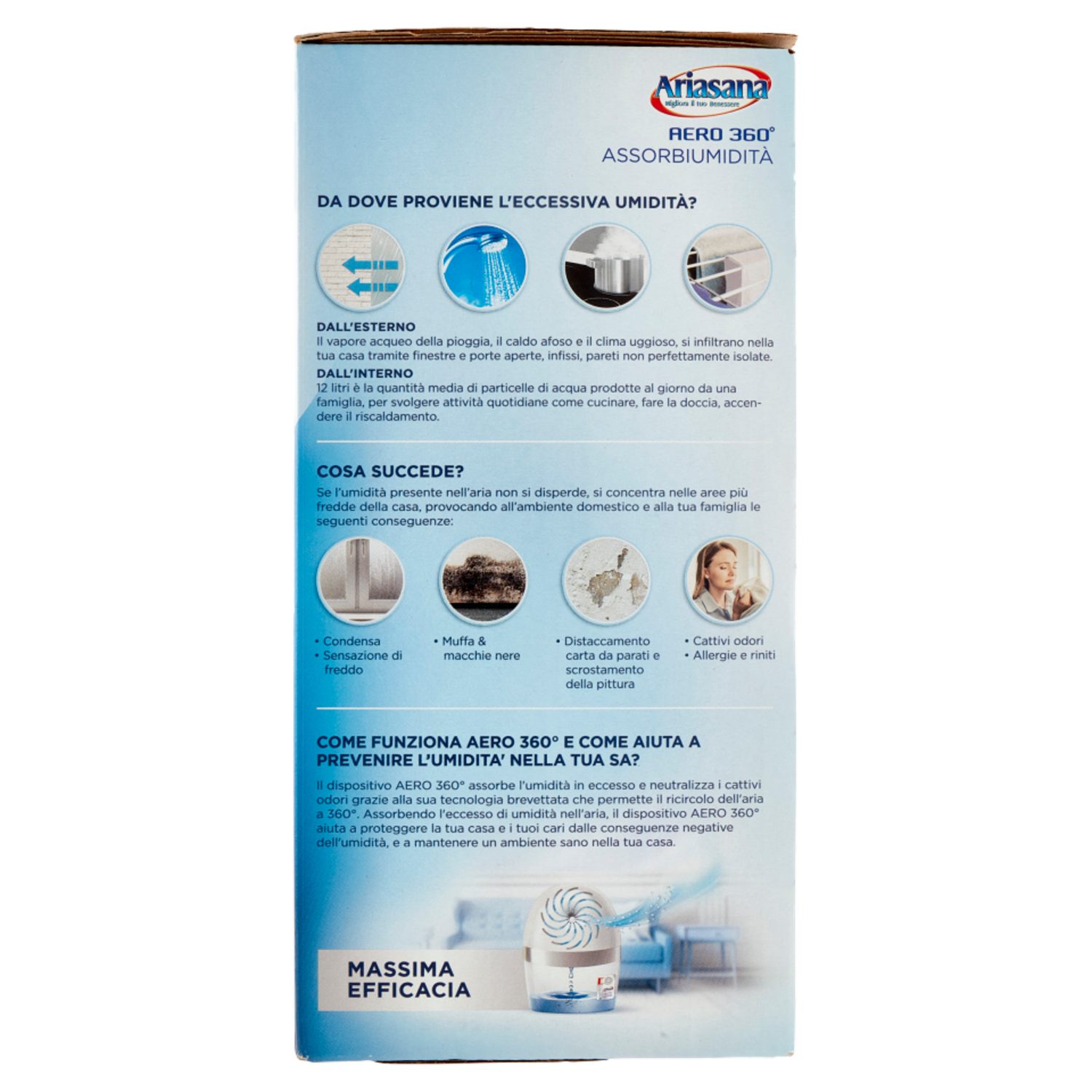2-in-1 Anti-umidità Massima efficacia La superficie ondulata (brevettata) e il foro centrale favoriscono un maggior contatto con l'aria, la composizione di cristalli attivi garantisce un ottimale assorbimento dell'umidità. Anti-odore Tecnologia brevettata Riduzione attiva dei cattivi odori grazie alla tecnologia anti-odore brevettata presente all'interno della Tab. Cattura e neutralizza i cattivi odori. Fino a 3 mesi - Lunga durata - Una singola Tab dura fino a 3 mesi in una stanza di 55m³.* Sicurezza garantita - Sistema anti rovesciamento e chiusura di sicurezza. Facile da usare - Apertura immediata dello sportellino tramite un solo tocco, foro per un facile svuotamento. Azione extra veloce - Prima goccia sole 12h.* Circolazione dell'aria a 360° - Il design aerodinamico del dispositivo permette la circolazione a 360° dell'aria attraverso e intorno la Tab. Indicatore di utilizzo - L'adesivo segnala quando è il momento di sostituire la ricarica Tab con una nuova. *In base alla temperatura e al grado di umidità della stanza. Da dove proviene l'eccessiva umidità? Dall'esterno Il vapore acqueo della pioggia, il caldo afoso e il clima uggioso, si infiltrano nella tua casa tramite finestre e porte aperte, infissi, pareti non perfettamente isolate. Dall'interno 12 litri è la quantità media di particelle di acqua prodotte al giorno da una famiglia, per svolgere attività quotidiane come cucinare, fare la doccia, accendere il riscaldamento. Come succede? Se l'umidità presente nell'aria non si disperde, si concentra nelle aree più fredde della casa, provocando all'ambiente domestico e alla tua famiglia le seguenti conseguenze: - Condensa - Sensazione di freddo - Muffa & macchie nere - Distaccamento carta da parati e scrostamento della pittura - Cattivi odori - Allergie e riniti Come funziona Aero 360° e come aiuta a prevenire l'umidità nella tua sa? Il dispositivo Aero 360° assorbe l'umidità in eccesso e neutralizza i cattivi odori grazie alla sua tecnologia brevettata che permette il ricircolo dell'aria a 360°. Assorbendo l'eccesso di umidità nell'aria, il dispositivo Aero 360° aiuta a proteggere la tua casa e i tuoi cari dalle conseguenza negative dell'umidità, e a mantenere un ambiente sano nella tua casa. Massima efficacia Aiuta a prevenire l'umidità nella tua casa - Camera da letto - Salotto - Cucina - Ripostiglio - Cantina Come funziona il dispositivo Aero 360°? 1. Il dispositivo Aero 360° assorbe l'eccesso di umidità nell'aria e neutralizza i cattivi odori grazie all'innovativo design che permette un flusso di circolazione dell'aria a 360° e grazie alla tecnologia brevettata 2-in-1 della Tab. 2. La Tab Aero 360° converte l'umidità in soluzione salina. 3. La soluzione salina viene raccolta nel cestino in basso.