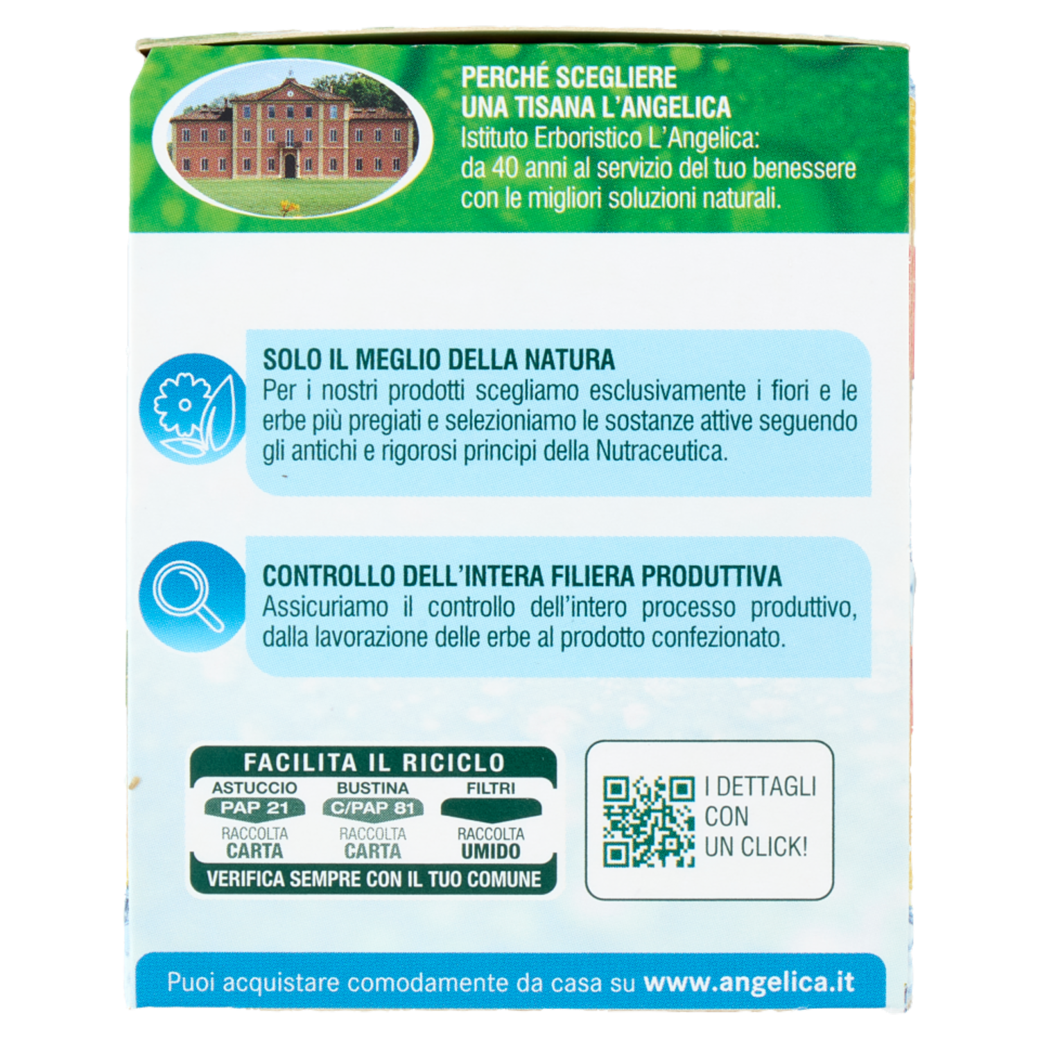 L'Angelica Istituto Erboristico Perché scegliere una tisana L'Angelica Istituto Erboristico L'Angelica: da 40 anni al servizio del tuo benessere con le migliori soluzioni naturali. Solo il meglio della natura Per i nostri prodotti scegliamo esclusivamente i fiori e le erbe più pregiati e selezioniamo le sostanze attive seguendo gli antichi e rigorosi principi della Nutraceutica. Controllo dell'intera filiera produttiva Assicuriamo il controllo dell'intero processo produttivo, dalla lavorazione delle erbe al prodotto confezionato. Puoi acquistare comodamente da casa su www.angelica.it