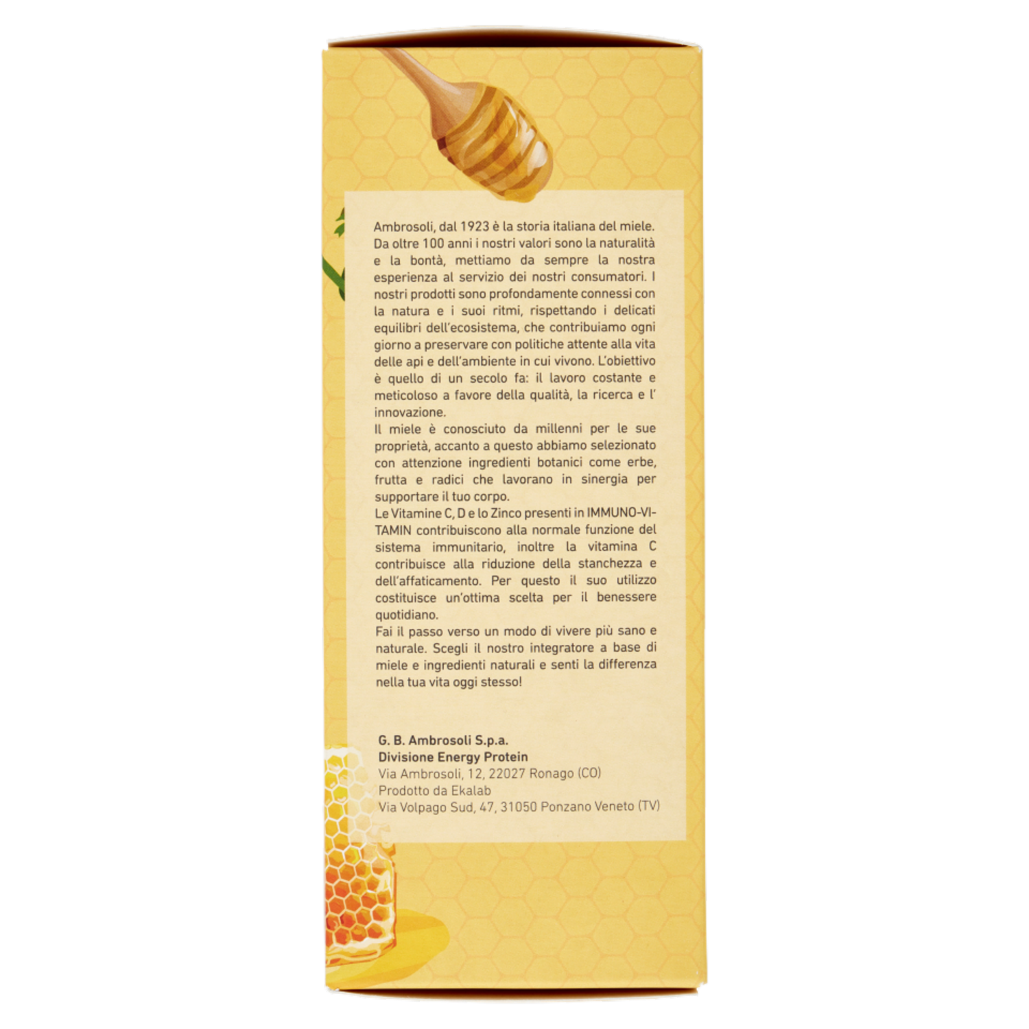 Ambrosoli, dal 1923 è la storia italiana del miele. Da oltre 100 anni i nostri valori sono la naturalità e la bontà, mettiamo da sempre la nostra esperienza al servizio dei nostri consumatori. I nostri prodotti sono profondamente connessi con la natura e i suoi ritmi, rispettando i delicati equilibri dell'ecosistema, che contribuiamo ogni giorno a preservare con politiche attente alla vita delle api e dell'ambiente in cui vivono. L'obiettivo è quello di un secolo fa: il lavoro costante e meticoloso a favore della qualità, la ricerca e l' innovazione. Il miele è conosciuto da millenni per le sue proprietà, accanto a questo abbiamo selezionato con attenzione ingredienti botanici come erbe, frutta e radici che lavorano in sinergia per supportare il tuo corpo. Le Vitamine C, D e lo Zinco presenti in Immuno-Vitamin contribuiscono alla normale funzione del sistema immunitario, inoltre la vitamina C contribuisce alla riduzione della stanchezza e dell'affaticamento. Per questo il suo utilizzo costituisce un'ottima scelta per il benessere quotidiano. Fai il passo verso un modo di vivere più sano e naturale. Scegli il nostro integratore a base di miele e ingredienti naturali e senti la differenza nella tua vita oggi stesso!