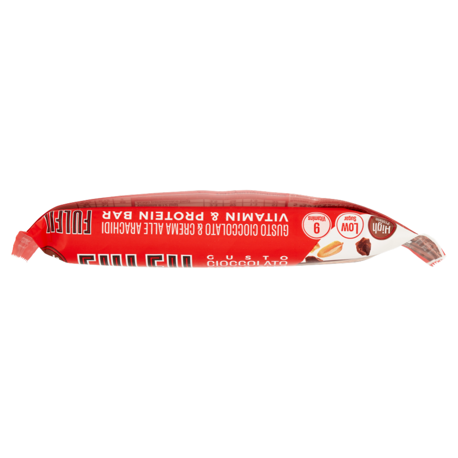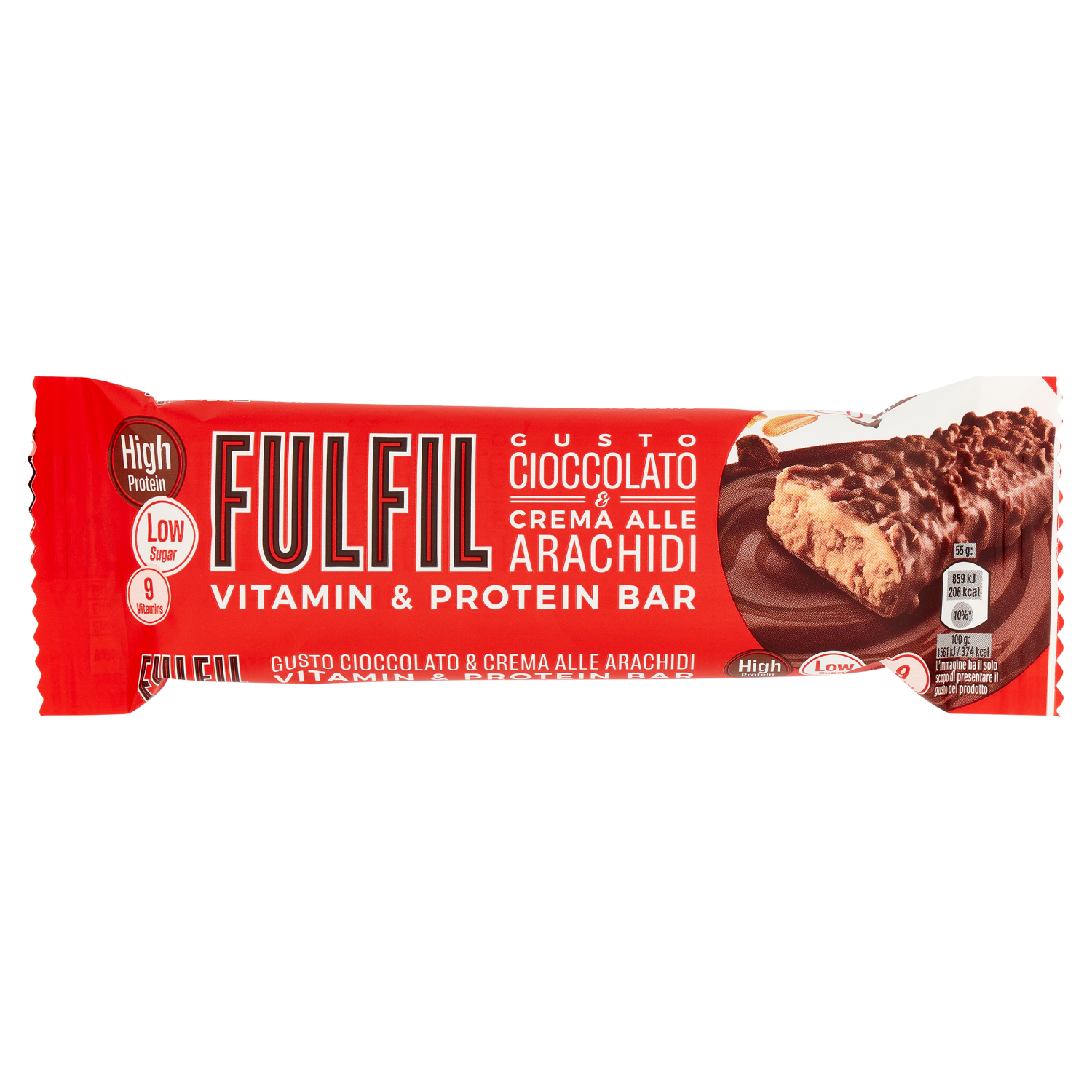 Barretta con vitamine ricca di proteine, ricoperta di cioccolato al latte con edulcorante, con crema (12,6%) al gusto di arachidi, con edulcoranti