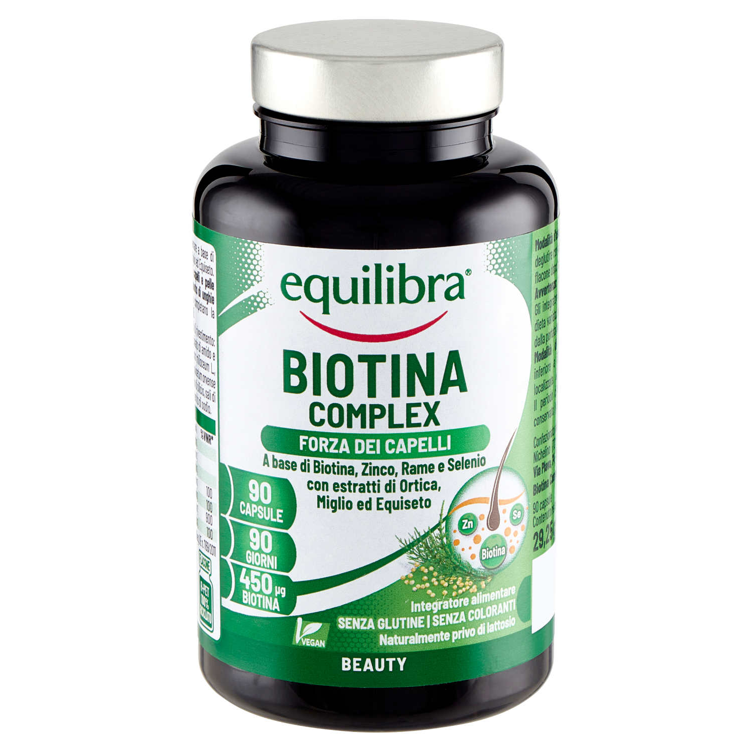 Biotina Complex Equilibra è un integratore alimentare a base di Biotina, Zinco, Rame e Selenio con estratti di Ortica, Miglio ed Equiseto. Biotina e Zinco contribuiscono al mantenimento di capelli e pelle normali, Zinco e Selenio contribuiscono al mantenimento di unghie normali. Gli estratti di Miglio, Ortica ed Equiseto completano la formulazione favorendo il benessere di unghie e capelli.