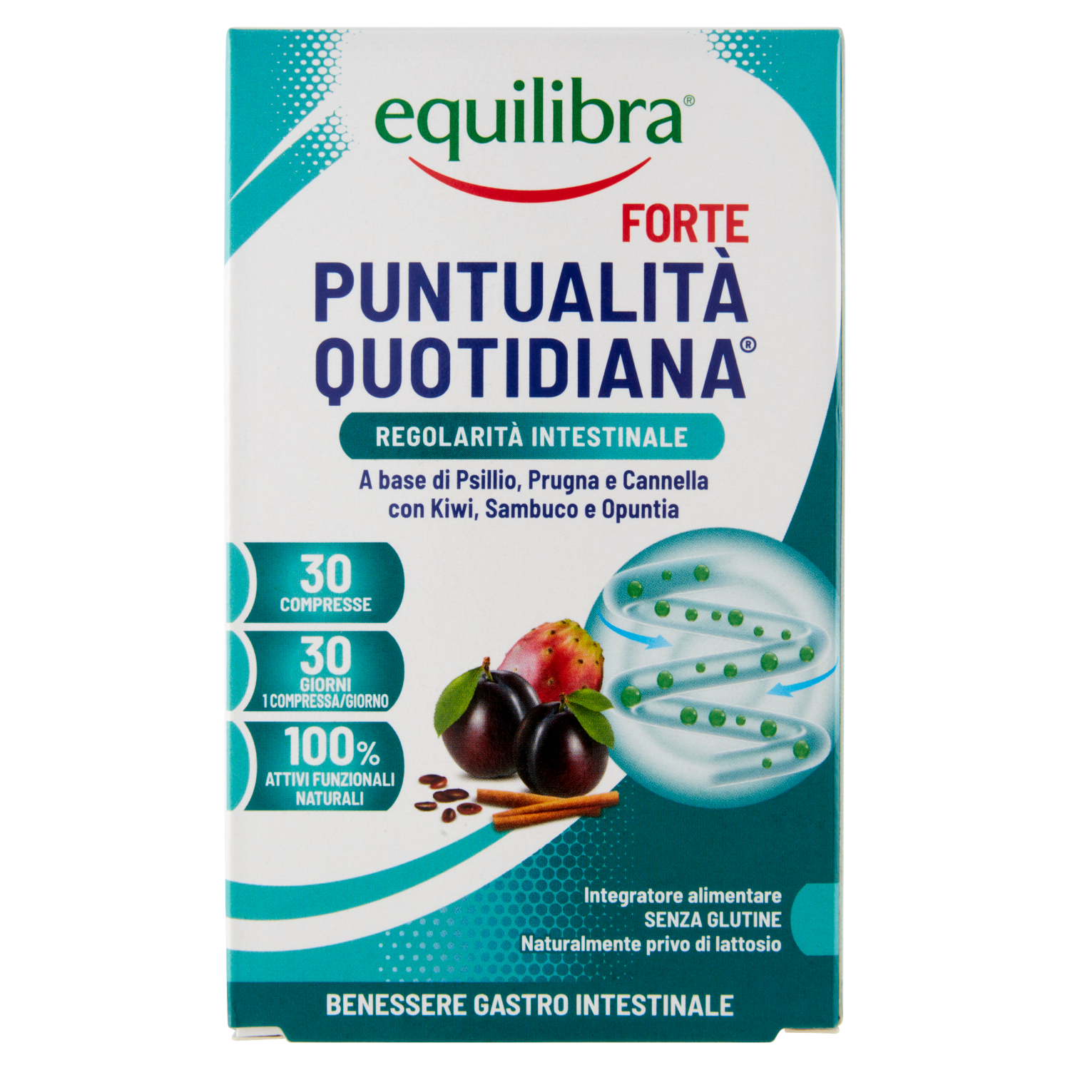 Puntualità quotidiana forte Regolarità intestinale Puntualità Quotidiana Forte Equilibra, è un integratore alimentare composto da 10 estratti vegetali, tra cui Psillio, Prugna, Cicoria, Boldo e Cannella che favoriscono la regolarità del transito intestinale. Lo Psillio, in particolare, ha anche un effetto prebiotico e un'azione emolliente e lenitiva sul sistema digerente, mentre il Cumino favorisce l'eliminazione dei gas. Regolarità intestinale Per favorire la regolarità intestinale, si consiglia ogni giorno di: - camminare o svolgere un'attività fisica leggera per almeno 20 minuti per tonificare la muscolatura addominale; - assumere un'abbondante quantità di liquidi nell'arco della giornata.