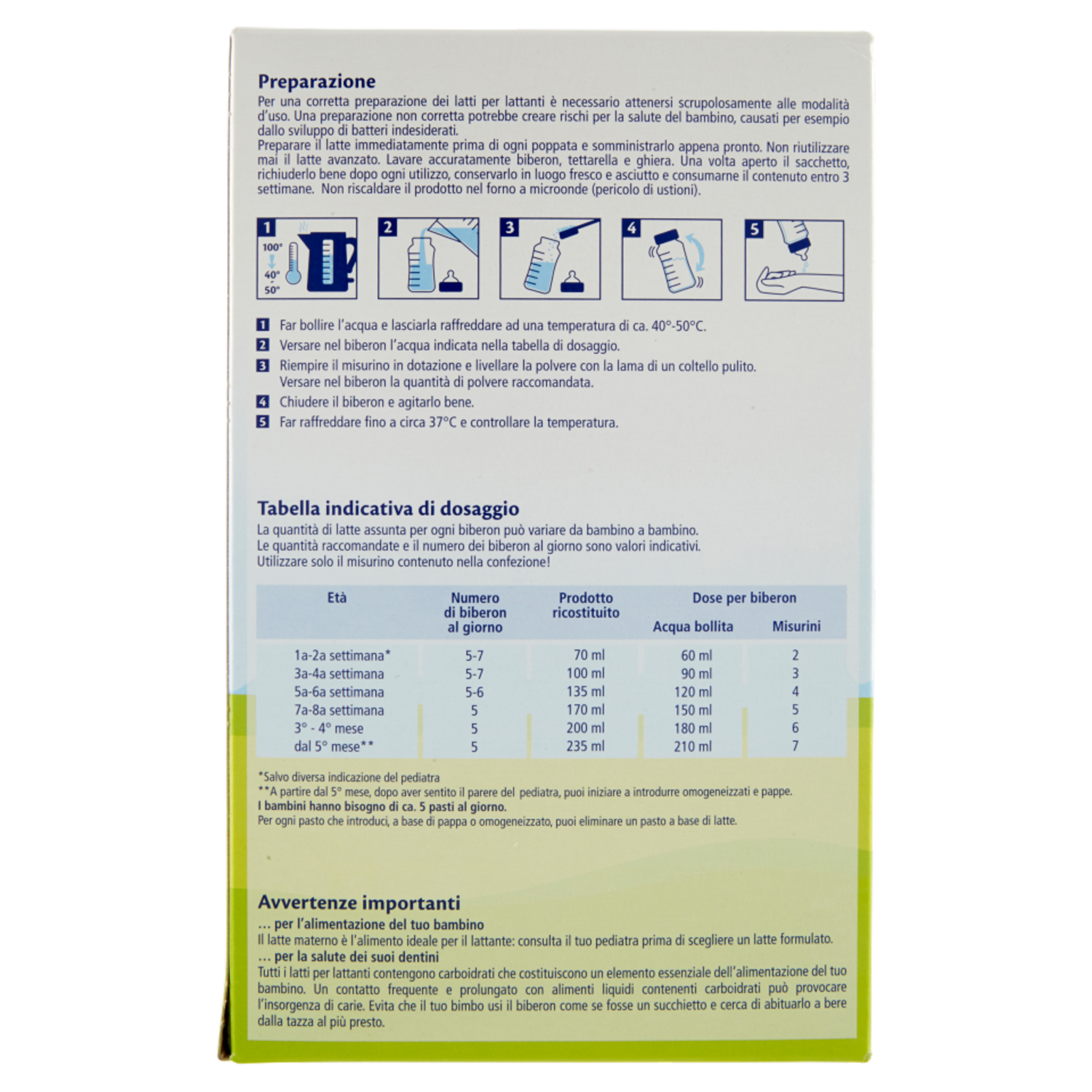 Preparazione Per una corretta preparazione dei latti per lattanti è necessario attenersi scrupolosamente alle modalità d'uso. Una preparazione non corretta potrebbe creare rischi per la salute del bambino, causati per esempio dallo sviluppo di batteri indesiderati. Preparare il latte immediatamente prima di ogni poppata e somministrarlo appena pronto. Non riutilizzare mai il latte avanzato. Lavare accuratamente biberon, tettarella e ghiera. Una volta aperto il sacchetto, richiuderlo bene dopo ogni utilizzo, conservarlo in luogo fresco e asciutto e consumarne il contenuto entro 3 settimane. Non riscaldare il prodotto nel forno a microonde (pericolo di ustioni). 1 Far bollire l'acqua e lasciarla raffreddare ad una temperatura di ca. 40°-50°C. 2 Versare nel biberon l'acqua indicata nella tabella di dosaggio. 3 Riempire il misurino in dotazione e livellare la polvere con la lama di un coltello pulito. Versare nel biberon la quantità di polvere raccomandata. 4 Chiudere il biberon e agitarlo bene. 5 Far raffreddare fino a circa 37°C e controllare la temperatura. Tabella indicativa di dosaggio La quantità di latte assunta per ogni biberon può variare da bambino a bambino. Le quantità raccomandate e il numero dei biberon al giorno sono valori indicativi. Utilizzare solo il misurino contenuto nella confezione! Età: 1a-2a settimana* | Numero di biberon al giorno: 5-7 | Prodotto ricostituito: 70 ml | Dose per biberon: Acqua bollita: 60 ml - Misurini: 2 Età: 3a-4a settimana | Numero di biberon al giorno: 5-7 | Prodotto ricostituito: 100 ml| Dose per biberon: Acqua bollita: 90 ml - Misurini: 3 Età: 5a-6a settimana | Numero di biberon al giorno: 5-6 | Prodotto ricostituito: 135 ml | Dose per biberon: Acqua bollita: 120 ml - Misurini: 4 Età: 7a-8a settimana | Numero di biberon al giorno: 5 | Prodotto ricostituito: 170 ml | Dose per biberon: Acqua bollita: 150 ml - Misurini: 5 Età: 3° - 4° mese | Numero di biberon al giorno: 5 | Prodotto ricostituito: 200 ml | Dose per biberon: Acqua bollita: 180 ml - Misurini: 6 Età: dal 5° mese** | Numero di biberon al giorno: 5 | Prodotto ricostituito: 235 ml | Dose per biberon: Acqua bollita: 210 ml - Misurini: 7 *Salvo diversa indicazione del pediatra ** A partire dal 5° mese, dopo aver sentito il parere del pediatra, puoi iniziare a introdurre omogeneizzati e pappe. I bambini hanno bisogno di ca. 5 pasti al giorno. Per ogni pasto che introduci, a base di pappa o omogeneizzato, puoi eliminare un pasto a base di latte. Avvertenze importanti ... per l'alimentazione del tuo bambino Il latte materno è l'alimento ideale per il lattante: consulta il tuo pediatra prima di scegliere un latte formulato. ... per la salute dei suoi dentini Tutti i latti per lattanti contengono carboidrati che costituiscono un elemento essenziale dell'alimentazione del tuo bambino. Un contatto frequente e prolungato con alimenti liquidi contenenti carboidrati può provocare l'insorgenza di carie. Evita che il tuo bimbo usi il biberon come se fosse un succhietto e cerca di abituarlo a bere dalla tazza al più presto. Questo prodotto ha lasciato i nostri stabilimenti in condizioni perfette. Prima dell'uso controllare che la confezione sia ancora integra.