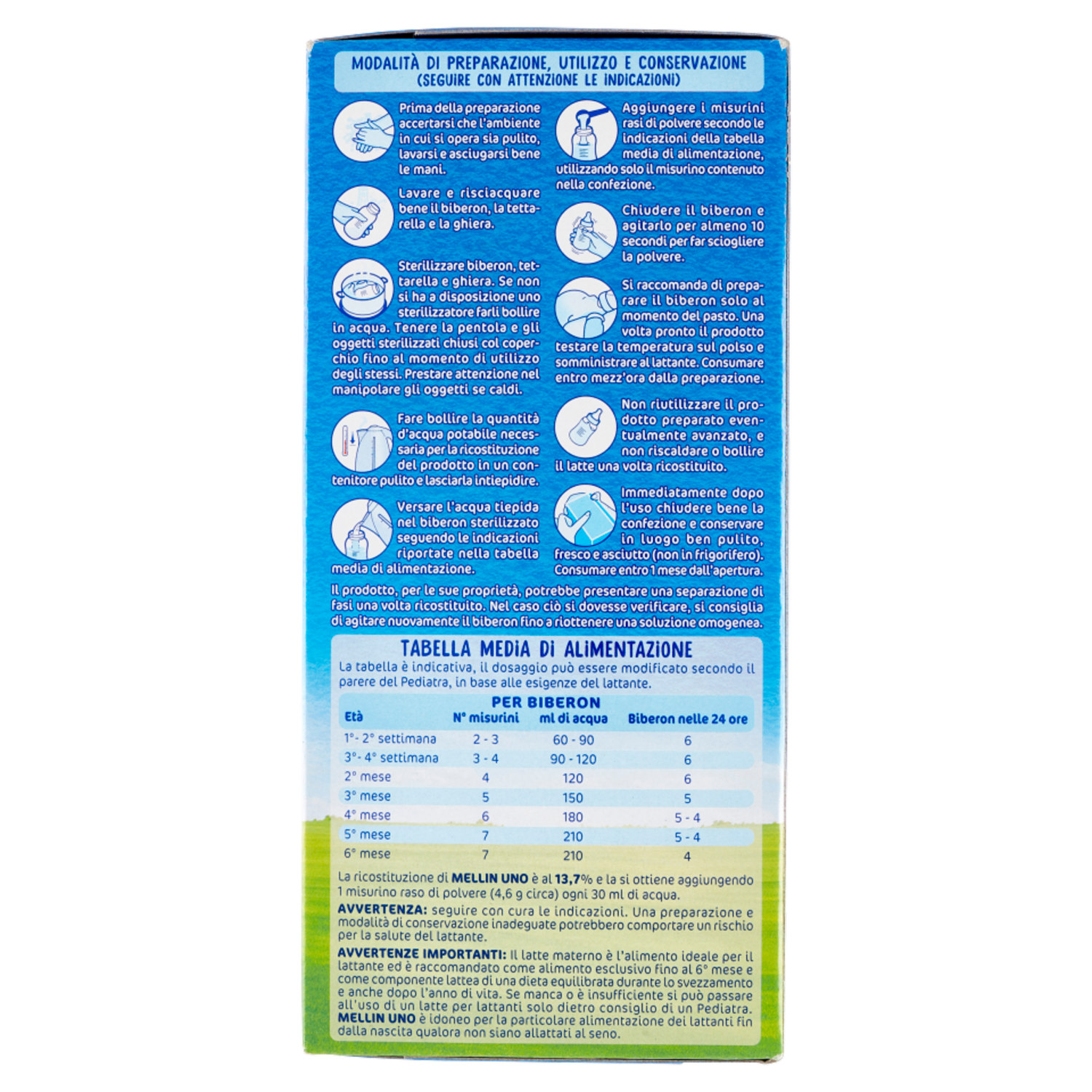 Modalità di preparazione, utilizzo e conservazione (seguire con attenzione le indicazioni) Prima della preparazione accertarsi che l'ambiente in cui si opera sia pulito, lavarsi e asciugarsi bene le mani. Lavare e risciacquare bene il biberon, la tettarella e la ghiera. Sterilizzare biberon, tettarella e ghiera. Se non si ha a disposizione uno sterilizzatore farli bollire in acqua. Tenere la pentola e gli oggetti sterilizzati chiusi col coperchio fino al momento di utilizzo degli stessi. Prestare attenzione nel manipolare gli oggetti se caldi. Fare bollire la quantità d'acqua potabile necessaria per la ricostituzione del prodotto in un contenitore pulito e lasciarla intiepidire. Versare l'acqua tiepida nel biberon sterilizzato seguendo le indicazioni riportate nella tabella media di alimentazione. Aggiungere i misurini rasi di polvere secondo le indicazioni della tabella media di alimentazione, utilizzando solo il misurino contenuto nella confezione. Chiudere il biberon e agitarlo per almeno 10 secondi per far scogliere la polvere. Si raccomanda di preparare il biberon solo al momento del pasto. Una volta pronto il prodotto testare la temperatura sul polso e somministrare al lattante. Consumare entro mezz'ora dalla preparazione. Non riutilizzare il prodotto preparato eventualmente avanzato, e non riscaldare o bollire il latte una volta ricostituito. Immediatamente dopo l'uso chiudere bene la confezione e conservare in luogo ben pulito, fresco e asciutto (non in frigorifero). Consumare entro 1 mese dall'apertura. Il prodotto, per le sue proprietà, potrebbe presentare una separazione di fasi una volta ricostituito. Nel caso ciò si dovesse verificare, si consiglia di agitare nuovamente il biberon fino a riottenere una soluzione omogenea. Tabella media di alimentazione La tabella è indicativa, il dosaggio può essere modificato secondo il parere del Pediatra, in base alle esigenze del lattante. Età: 1°- 2° settimana | N° misurini: 2 - 3 | ml di acqua: 60 - 90 | Biberon nelle 24 ore: 6 Età: 3°- 4° settimana | N° misurini: 3 - 4 | ml di acqua: 90 - 120 | Biberon nelle 24 ore: 6 Età: 2° mese | N° misurini: 4 | ml di acqua: 120 | Biberon nelle 24 ore: 6 Età: 3° mese | N° misurini: 5 | ml di acqua: 150 | Biberon nelle 24 ore: 5 Età: 4° mese | N° misurini: 6 | ml di acqua: 180 | Biberon nelle 24 ore: 5 - 4 Età: 5° mese | N° misurini: 7 | ml di acqua: 210 | Biberon nelle 24 ore: 5 - 4 Età: 6° mese | N° misurini: 7 | ml di acqua: 210 | Biberon nelle 24 ore: 4 La ricostituzione di Mellin Uno è al 13,7% e la si ottiene aggiungendo 1 misurino raso di polvere (4,6 g circa) ogni 30 ml di acqua. Avvertenza: seguire con cura le indicazioni. Una preparazione e modalità di conservazione inadeguate potrebbero comportare un rischio per la salute del lattante. Avvertenze importanti: Il latte materno è l'alimento ideale per il lattante ed è raccomandato come alimento esclusivo fino al 6° mese e come componente lattea di una dieta equilibrata durante lo svezzamento e anche dopo l'anno di vita. Se manca o è insufficiente si può passare all'uso di un latte per lattanti solo dietro consiglio di un Pediatria. Mellin Uno è idoneo per la particolare alimentazione dei lattanti fin dalla nascita qualora non siano allattati al seno.