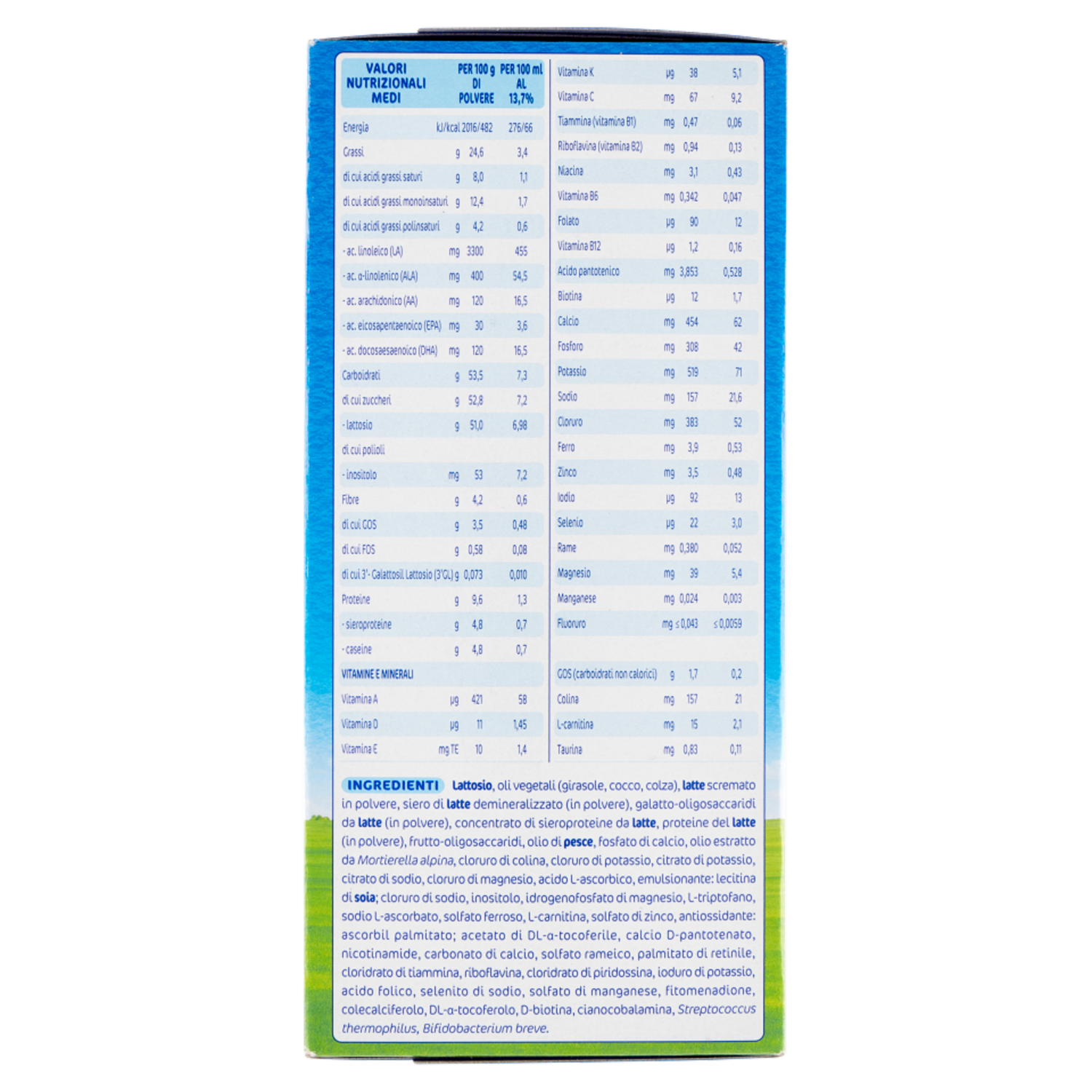 | Per 100 g di polvere | Per 100 ml al 13,7% | |