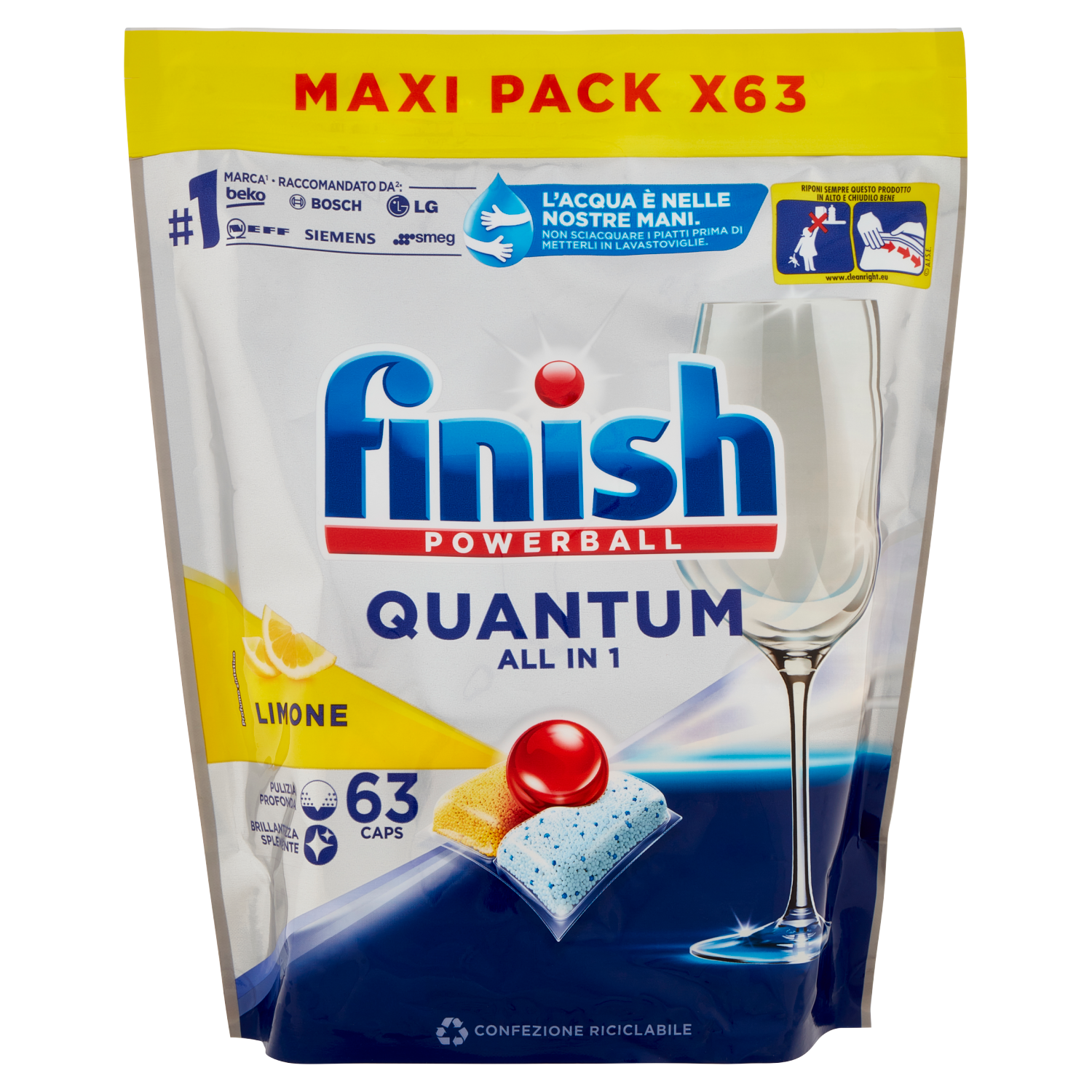 ATTENZIONE Finish Quantum All in 1 Limone. Detergente per lavastoviglie in capsule. Provoca grave irritazione oculare. Provoca irritazione cutanea. Contiene Subtilisina. Può provocare una reazione allergica. Tenere fuori dalla portata dei bambini. IN CASO DI CONTATTO CON GLI OCCHI: sciacquare accuratamente per parecchi minuti. Togliere le eventuali lenti a contatto se è agevole farlo. Continuare a sciacquare. Se l'irritazione degli occhi persiste, consultare un medico. IN CASO DI CONTATTO CON LA PELLE: lavare abbondantemente con acqua. In caso di consultazione di un medico, tenere a disposizione il contenitore o l'etichetta del prodotto. Non ingerire. In caso di ingestione consultare immediatamente un medico. UFI: 4Y72-F05V-X00X-XVHT Riponi sempre questo prodotto in alto e chiudilo bene Tenere lontano dai bambini Chiudere il sacchetto correttamente A.I.S.E. www.cleanright.eu