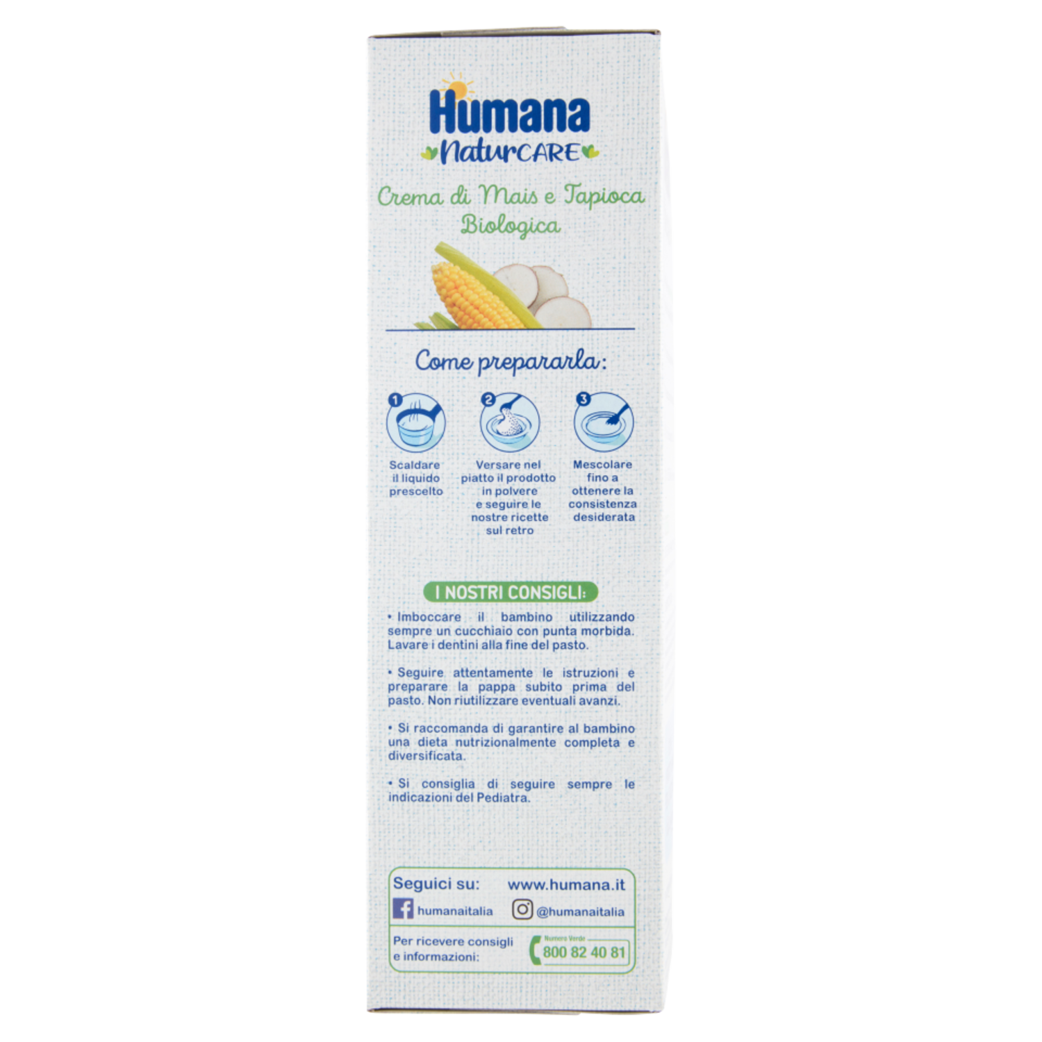 Da 4+ mesi Le nostre ricette: Con Latte Humana 2 di proseguimento (dopo il 6° mese): - 3 cucchiai da tavola di Crema di Mais e Tapioca Biologica (ca. 22 g) da stemperare in 210 ml di latte Humana 2 caldo. Con brodo vegetale o di carne: - 3 cucchiai da tavola di Crema di Mais e Tapioca Biologica (ca. 22 g) da stemperare in 210 ml di brodo vegetale o di carne caldo. Aggiungere un Omogeneizzato Biologico Humana di carne, cominciando con metà e passando gradualmente all'intero vasetto e condire infine con 5 g di olio extra vergine di oliva (ca. 1 cucchiaino da tè). In tutte le ricette suggerite le quantità di Pappa o Crema in polvere e di liquido aggiunto sono indicative e possono variare secondo i gusti, l'appetito del bambino ed il consiglio del Pediatra. Come prepararlo: 1. Scaldare il liquido prescelto 2. Versare nel piatto il prodotto in polvere e seguire le nostre ricette sul retro 3. Mescolare fino a ottenere la consistenza desiderata I nostri consigli - Imboccare il bambino utilizzando sempre un cucchiaio con punta morbida. Pulire i dentini alla fine del pasto. - Seguire attentamente le istruzioni e preparare la papa subito prima del pasto. Non riutilizzare eventuali avanzi. - Si raccomanda di garantire al bambino una dieta nutrizionalmente completa e diversificata. - Si consigliata di seguire sempre le indicazioni del Pediatra.