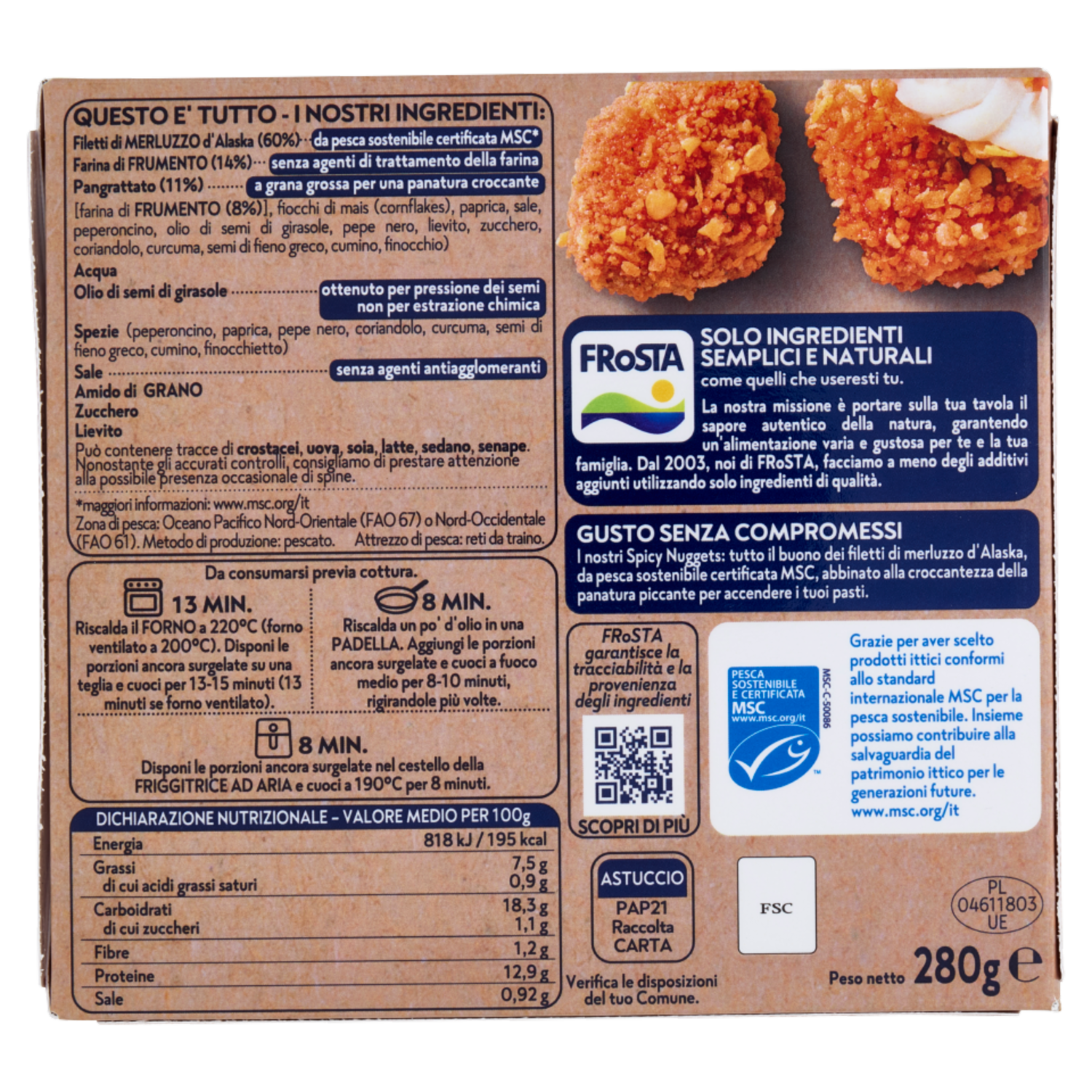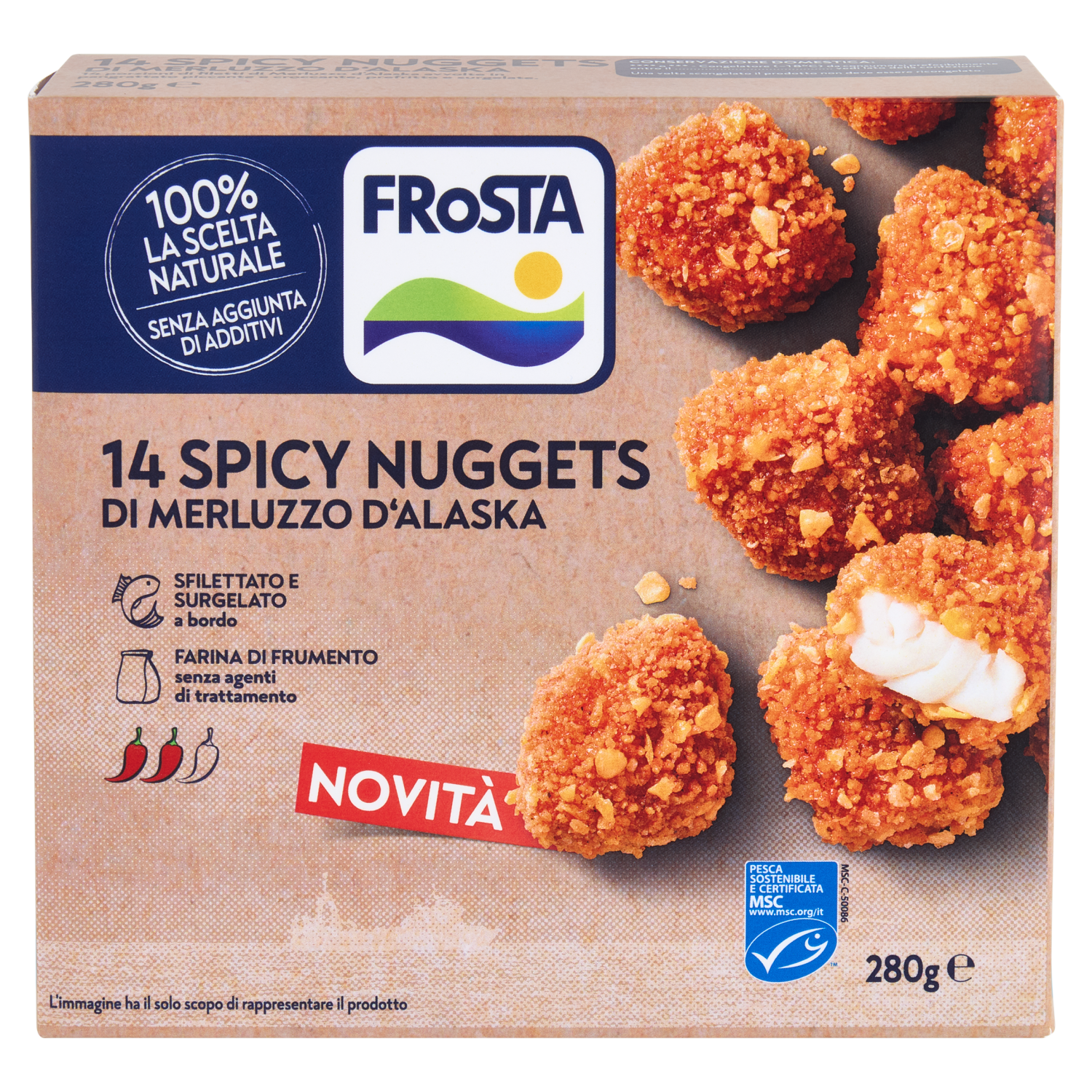 Questo e' tutto - I nostri ingredienti: Filetti di Merluzzo d'Alaska (60%) - da pesca sostenibile certificata MSC* Farina di Frumento (14%) - senza agenti di trattamento della farina Pangrattato (11%) - a grana grossa per una panatura croccante [farina di Frumento (8%)], fiocchi di mais (cornflakes), paprica, sale, peperoncino, olio di semi di girasole, pepe nero, lievito, zucchero, coriandolo, curcuma, semi di fieno greco, cumino, finocchio) Acqua Olio di semi di girasole - ottenuto per pressione dei semi non per estrazione chimica Spezie (peperoncino, paprica, pepe nero, coriandolo, curcuma, semi di fieno greco, cumino, finocchietto) Sale - senza agenti antiagglomeranti Amido di Grano Zucchero Lievito Può contenere tracce di crostacei, uova, soia, latte, sedano, senape. *maggiori informazioni: www.msc.org/it Zona di pesca: Oceano Pacifico Nord-Orientale (FAO 67) o Nord-Occidentale (FAO 61). Metodo di produzione: pescato. Attrezzo di pesca: reti da traino. FRoSTA - Solo Ingredienti Semplici e Naturali come quelli che useresti tu. La nostra missione è portare sulla tua tavola il sapore autentico della natura, garantendo un'alimentazione varia e gustosa per te e la tua famiglia. Dal 2003, noi di FRoSTA, facciamo a meno degli additivi aggiunti utilizzando solo ingredienti di qualità. Gusto senza compromessi I nostri Spicy Nuggets: tutto il buono dei filetti di merluzzo d'Alaska, da pesca sostenibile certificata MSC, abbinato alla croccantezza della panatura piccante per accendere i tuoi pasti.