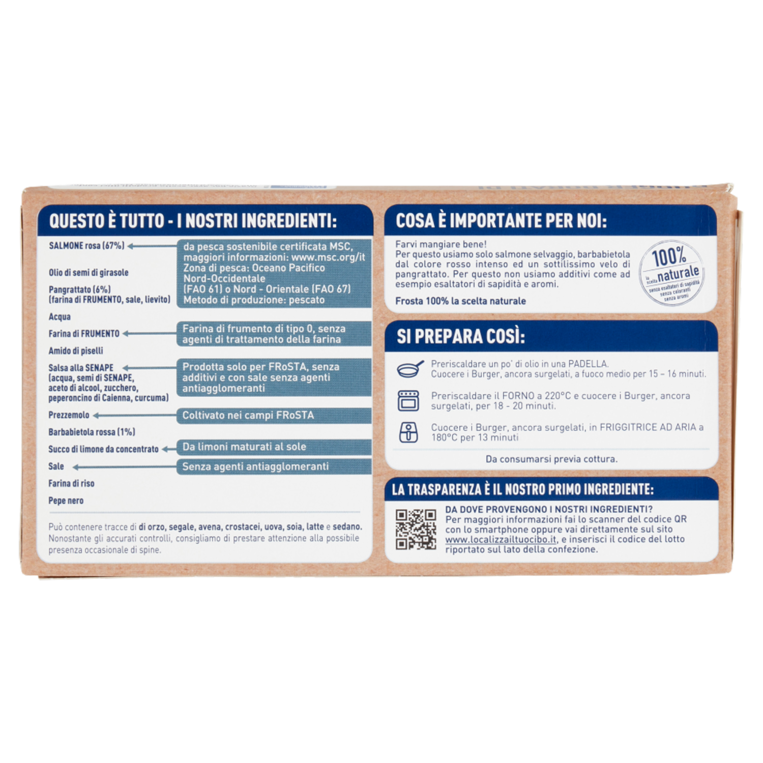 Questo è tutto - I nostri ingredienti: Salmone rosa (67%) - da pesca sostenibile certificata MSC, maggiori informazioni: www.msc.org/it - Zona di pesca: Oceano Pacifico Nord- Orientale (FAO 61) o Nord - Occidentale (FAO 61) o Nord - Orientale (FAO 67) - Metodo di produzione: pescato Olio di semi di girasole Pangrattato (6%) (farina di Frumento, sale, lievito) Acqua Farina di Frumento - Farina di frumento di tipo 0, senza agenti di trattamento della farina Amido di piselli Salsa alla Senape (acqua, semi di Senape, aceto di alcool, zucchero, peperoncino di Caienna, curcuma) - Prodotta solo per Frosta, senza additivi e con sale senza agenti antiagglomeranti Prezzemolo - Coltivato nei campi Frosta Barbabietola rossa (1%) Succo di limone da concentrato - Da limoni maturati al sole Sale - Senza agenti antiagglomeranti Farina di riso Pepe nero Cosa è importante per noi: Farvi mangiare bene! Per questo usiamo solo salmone selvaggio, barbabietola dal colore rosso intenso ed un sottilissimo velo di pangrattato. Per questo non usiamo additivi come ad esempio esaltatori di sapidità e aromi. Frosta 100% la scelta naturale! senza esaltatori di sapidità senza coloranti senza aromi