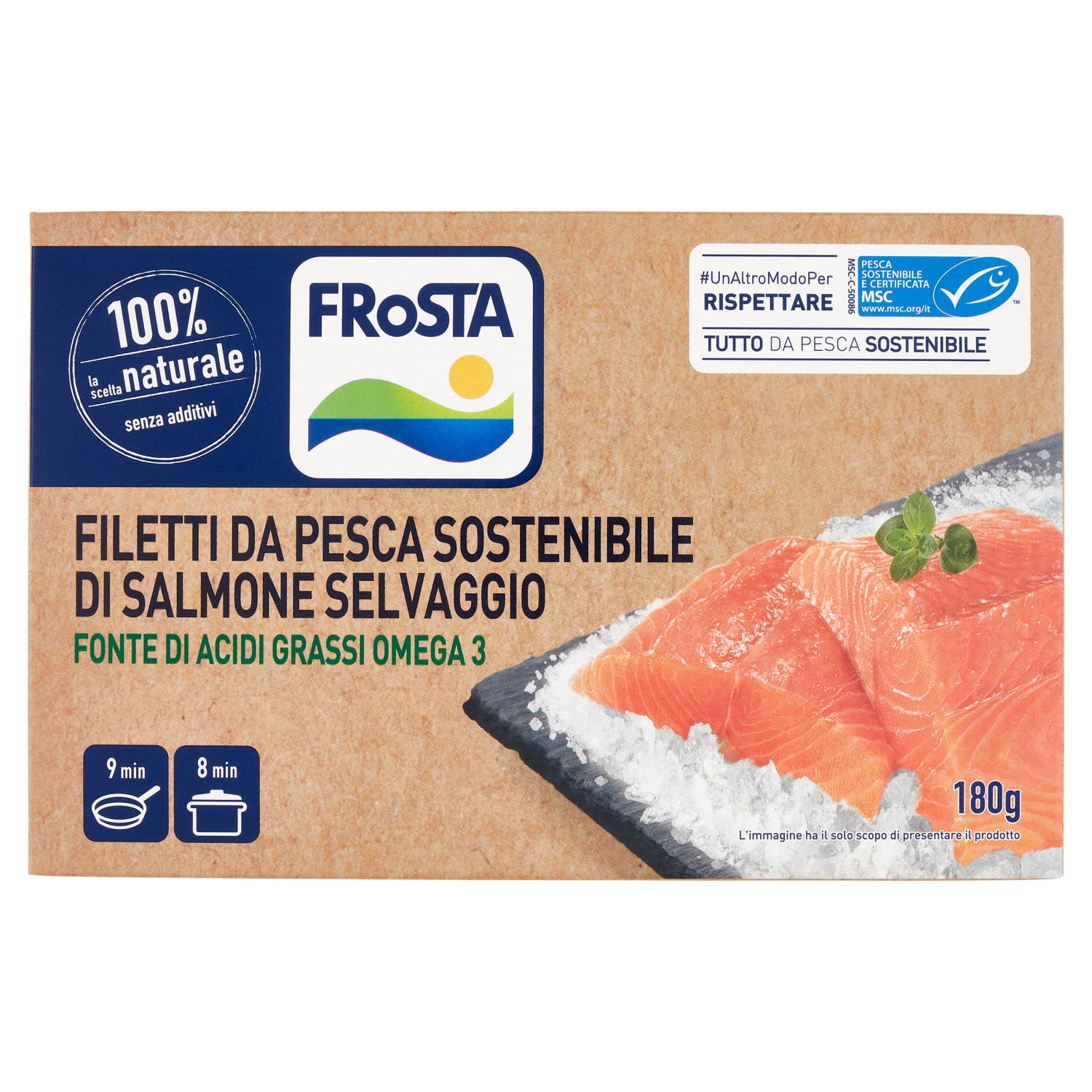 Questo è tutto - I nostri ingredienti Filetti di Salmone rosa (Oncorhynchus gorbuscha) - da pesca sostenibile certificata MSC, maggiori informazioni: www.msc.org/it. Zona di pesca: Oceano Pacifico Nord-Occidentale (FAO 61) o Nord - Orientale (FAO 67). Metodo di produzione: pescato. Attrezzo di pesca: 1) sciabiche 3) reti da imbrocco e reti analoghe 4) reti da circuizione e reti da raccolta 5) ami e palangari 7) nasse e trappole Cosa è importante per noi: Farvi mangiare bene! Il nostro salmone selvaggio, a differenza di quello d'allevamento, si muove libero attraverso fiumi e mari, nutrendosi solo di ciò che offre la natura. La sua carne gustosa, è fonte di Omega-3. Frosta 100% la scelta naturale! 100% La scelta naturale - senza additivi La trasparenza è il nostro primo ingrediente: Da dove provengono i nostri ingredienti? Per maggiori informazioni fai lo scanner del codice QR con lo smartphone oppure vai direttamente sul sito www.localizzailtuocibo.it e inserisci il codice del lotto riportato sul lato della confezione.