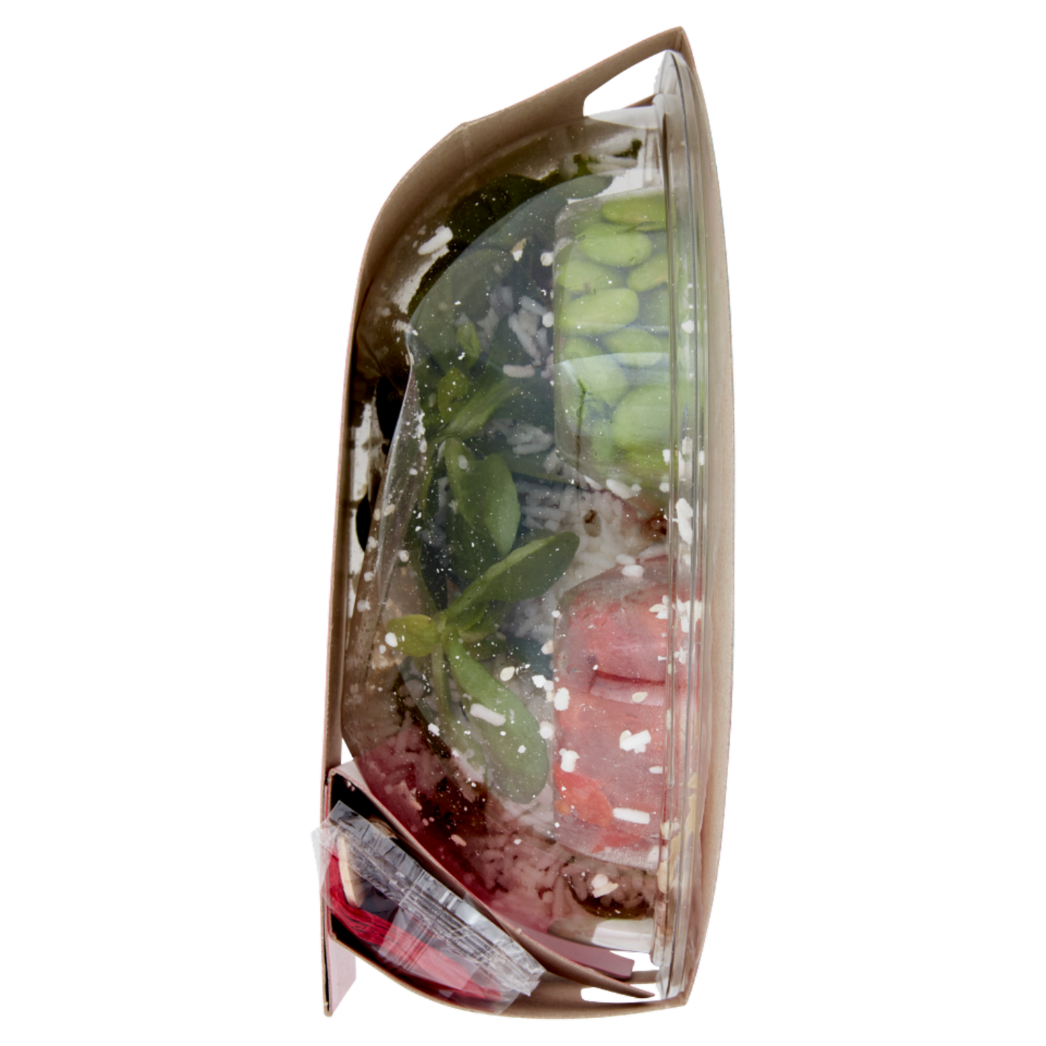 Piatto pronto a base di riso arricchito con salmone affumicato, soia edamame, mango e pomodori secchi