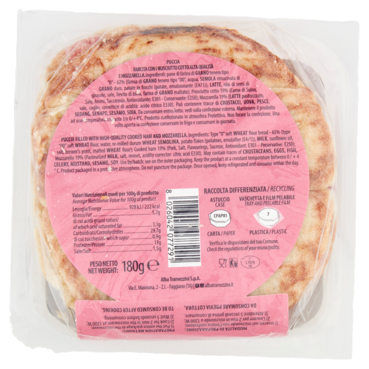 alba Tramezzini Puccia Prosciutto Cotto Alta Qualità e Mozzarella 180 g