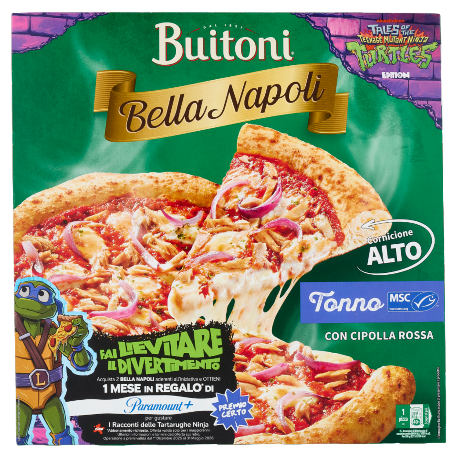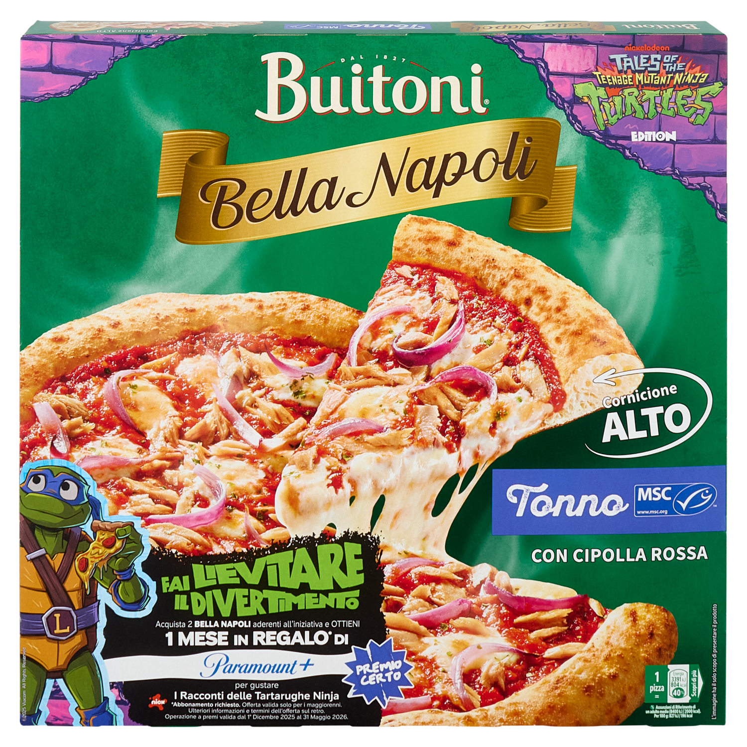 nickelodeon Tales of the teenage mutant ninja turtles Edition Fai lievitare il divertimento Acquista 2 Bella Napoli aderenti all'iniziativa e Ottieni 1 Mese in Regalo* di Paramount+ Premio certo per gustare I Racconti delle Tartarughe Ninja *Abbonamento richiesto. Offerta valida solo per i maggiorenni. Ulteriori informazioni e termini dell'offerta sul retro. Operazione a premi valida dal 1° Dicembre 2025 al 31 Maggio 2026. Fai lievitare il divertimento Partecipare è facile: 1 Acquista almeno due pizze Bella Napoli aderenti all'iniziativa 2 Registrati al sito www.buitonifailievitareildivertimento.it compilando il form e caricando la ricevuta d'acquisto 3 Ottieni per email il codice che ti dà diritto ad un 1 mese di Paramount+* in regalo *Offerta Paramount+: Riservata a maggiorenni residenti in Italia e San Marino. Promozione valida dal 01/12/2025 al 31/05/2026, con l'acquisto di 2 confezioni di pizza Bella Napoli aderenti all'iniziativa, da fare in un'unica transazione. Solo per nuovi o ex abbonati Paramount+. Solo un codice per persona. Vai sul sito www.buitonifailievitareildivertimento.it, carica lo scontrino dell'acquisto e inserisci i dettagli. Entro 14 giorni, i partecipanti validi riceveranno un codice promozionale da usare su www.paramountplus.com. Per ottenere 1 mese di Paramount+ offerto da noi, è necessario aderire ad un Abbonamento Mensile Standard. Dopo il primo mese l'abbonamento si rinnoverà automaticamente al prezzo mensile standard applicabile in quel momento salvo recesso. Alla data di stampa, il prezzo è di € 7,99/mese. Il codice deve essere attivato entro il 31/07/2026. Sono necessari dispositivi compatibili, accesso internet e indirizzo email valido. Si applicano i Termini e condizioni interamente consultabili su www.buitonifailievitareildivertimento.it. Promotore: European Pizza Group SpA.