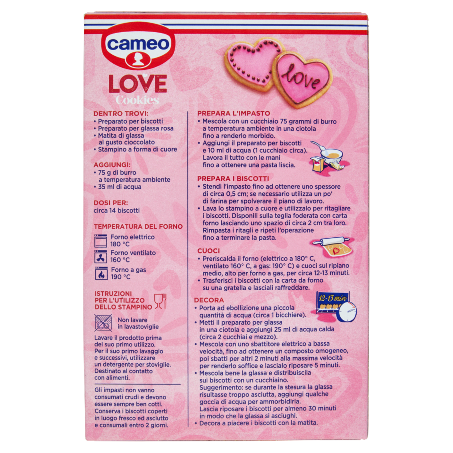 Dentro trovi: - Preparato per biscotti - Preparato per glassa rosa - Matita di glassa al gusto cioccolato - Stampino a forma di cuore Aggiungi: - 75 g di burro a temperatura ambiente - 35 ml di acqua Dosi per: circa 14 biscotti Temperatura del forno Forno elettrico 180 °C Forno ventilato 160 °C Forno a gas 190 °C Istruzioni per l'utilizzo dello stampino Non lavare in lavastoviglie Lavare il prodotto prima del suo primo utilizzo. Per il suo primo lavaggio e successivi, utilizzare un detergente per stoviglie. Destinato al contatto con alimenti. Gli impasti non vanno consumati crudi e devono essere sempre ben cotti. Conserva i biscotti coperti in luogo fresco ed asciutto e consumali entro 2 giorni. Prepara l'impasto - Mescola con un cucchiaio 75 grammi di burro a temperatura ambiente in una ciotola fino a renderlo morbido. - Aggiungi il preparato per biscotti e 10 ml di acqua (1 cucchiaio circa). Lavora il tutto con le mani fino a ottenere una pasta liscia. Prepara i biscotti - Stendi l'impasto fino ad ottenere uno spessore di circa 0,5 cm; se necessario utilizza un po' di farina per spolverare il piano di lavoro. - Lava lo stampino a cuore e utilizzalo per ritagliare i biscotti. Disponili sulla teglia foderata con carta forno lasciando uno spazio di circa 2 cm tra loro. Rimpasta i ritagli e ripeti l'operazione fino a terminare la pasta. Cuoci - Preriscalda il forno (elettrico a 180° C, ventilato 160° C, a gas: 190° C) e cuoci sul ripiano medio, alto per forno a gas, per circa 12-13 minuti. - Trasferisci i biscotti con la carta da forno su una gratella e lasciali raffreddare. Decora - Porta ad ebollizione una piccola quantità di acqua (circa 1 bicchiere). - Metti il preparato per glassa in una ciotola e aggiungi 25 ml di acqua calda (circa 2 cucchiai e mezzo). - Mescola con uno sbattitore elettrico a bassa velocità, fino ad ottenere un composto omogeneo, poi sbatti per altri 2 minuti alla massima velocità per renderlo soffice e lascialo riposare 5 minuti. - Mescola bene la glassa e distribuiscila sui biscotti con un cucchiaino. Suggerimento: se durante la stesura la glassa risultasse troppo asciutta, aggiungi qualche goccia di acqua per ammorbidirla. Lascia riposare i biscotti per almeno 30 minuti in modo che la glassa si asciughi. - Decora a piacere i biscotti con la matita.