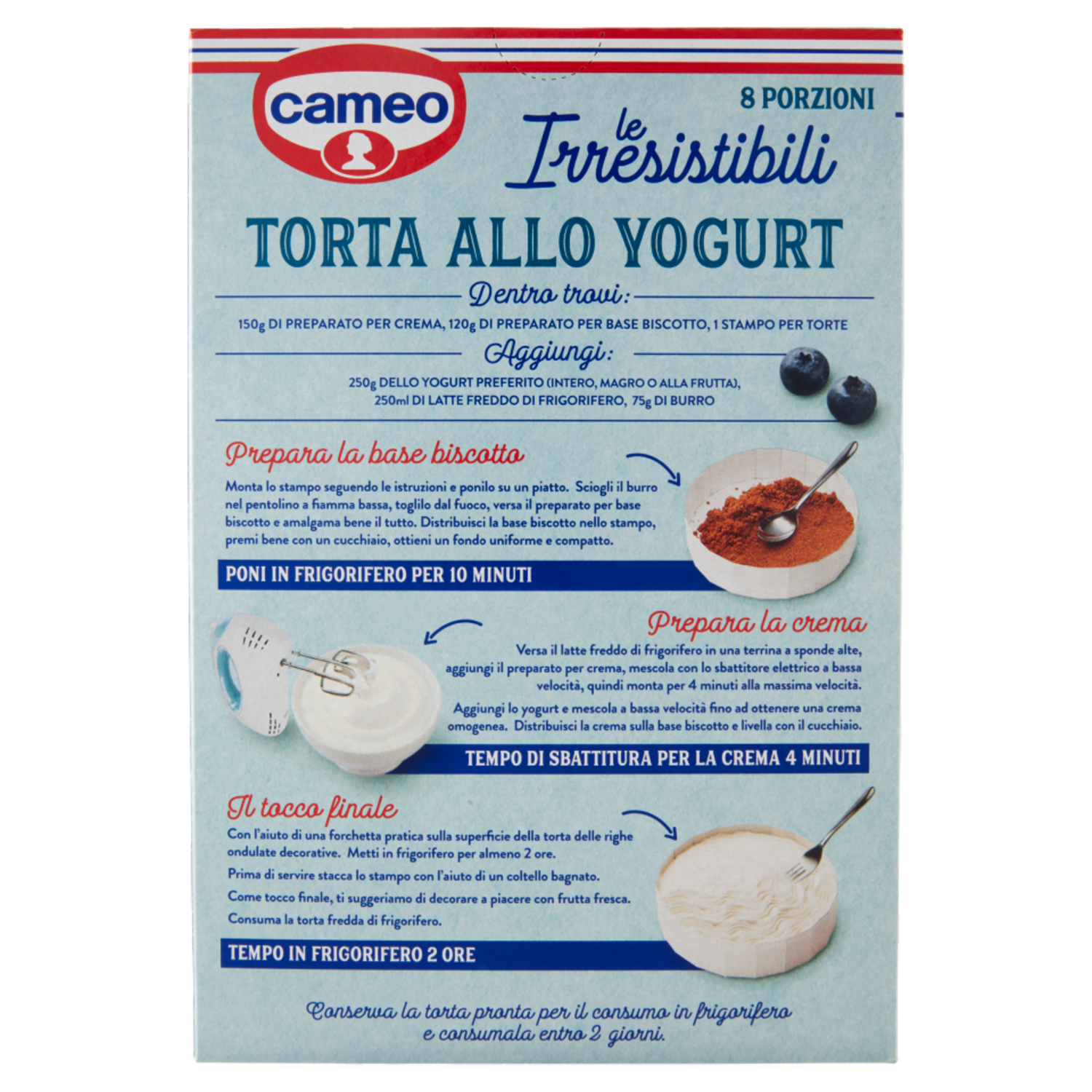 Dentro trovi: 150g di preparato per crema, 120g di preparato per base biscotto, 1 stampo per torte Aggiungi: 250g dello yogurt preferito (intero, magro o alla frutta), 250ml di latte freddo di frigorifero, 75g di burro Prepara la base biscotto Monta lo stampo seguendo le istruzioni e ponilo su un piatto. Sciogli il burro nel pentolino a fiamma bassa, toglilo dal fuoco, versa il preparato per base biscotto e amalgama bene il tutto. Distribuisci la base biscotto nello stampo, premi bene con un cucchiaio, ottieni un fondo uniforme e compatto. Poni in frigorifero per 10 minuti Prepara la crema Versa il latte freddo di frigorifero in una terrina a sponde alte, aggiungi il preparato per crema, mescola con lo sbattitore elettrico a bassa velocità, quindi monta per 4 minuti alla massima velocità. Aggiungi lo yogurt e mescola a bassa velocità fino ad ottenere una crema omogenea. Distribuisci la crema sulla base biscotto e livella con il cucchiaio. Tempo di sbattitura per la crema 4 minuti Il tocco finale Con l'aiuto di una forchetta pratica sulla superficie della torta delle righe ondulate decorative. Metti in frigorifero per almeno 2 ore. Prima di servire stacca lo stampo con l'aiuto di un coltello bagnato. Come tocco finale, ti suggeriamo di decorare a piacere con frutta fresca. Consuma la torta fredda di frigorifero. Tempo in frigorifero 2 ore Conserva la torta pronta per il consumo in frigorifero e consumala entro 2 giorni.