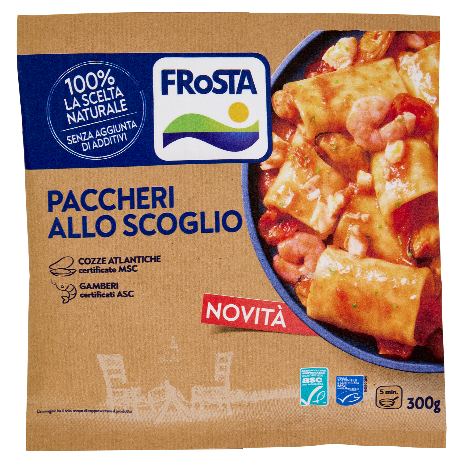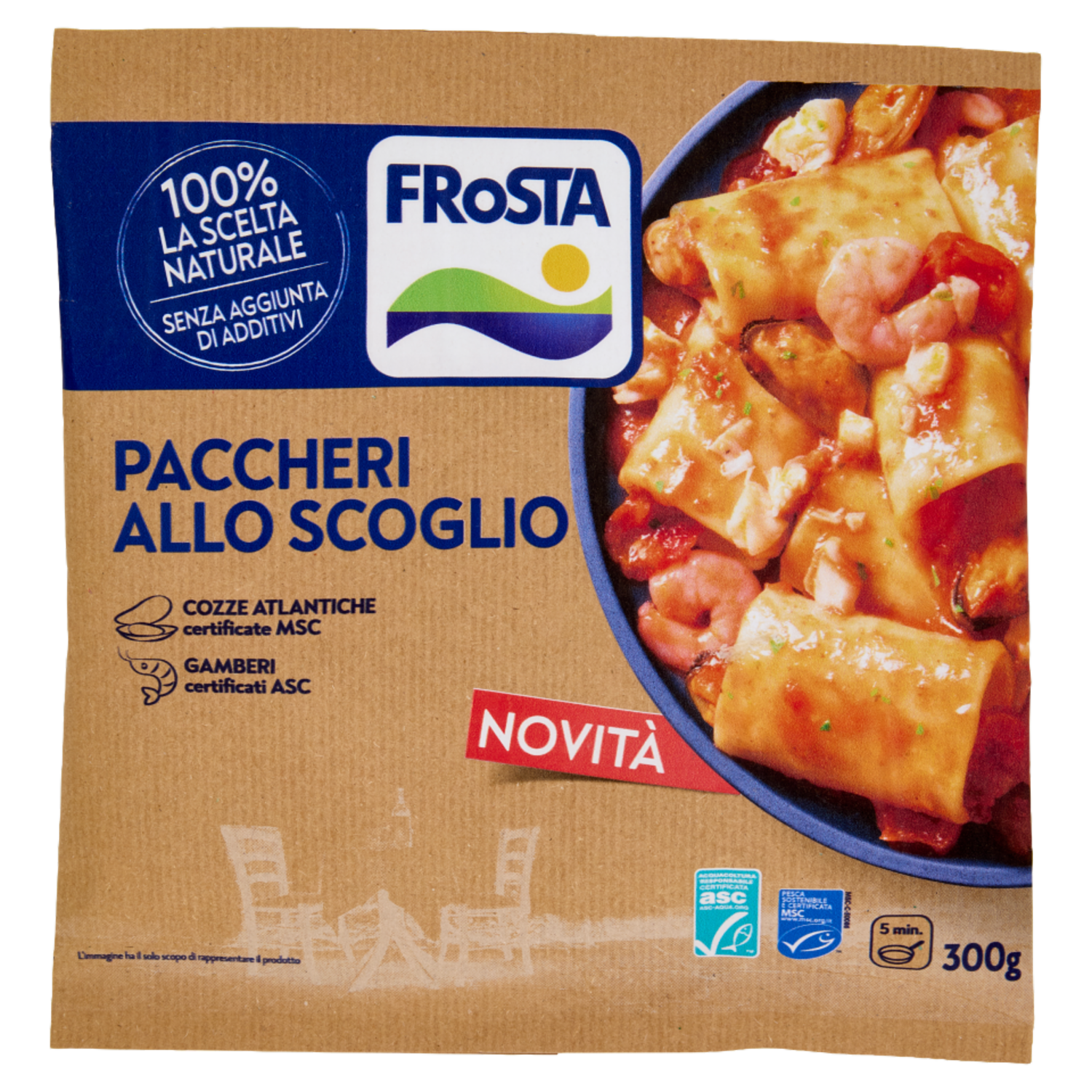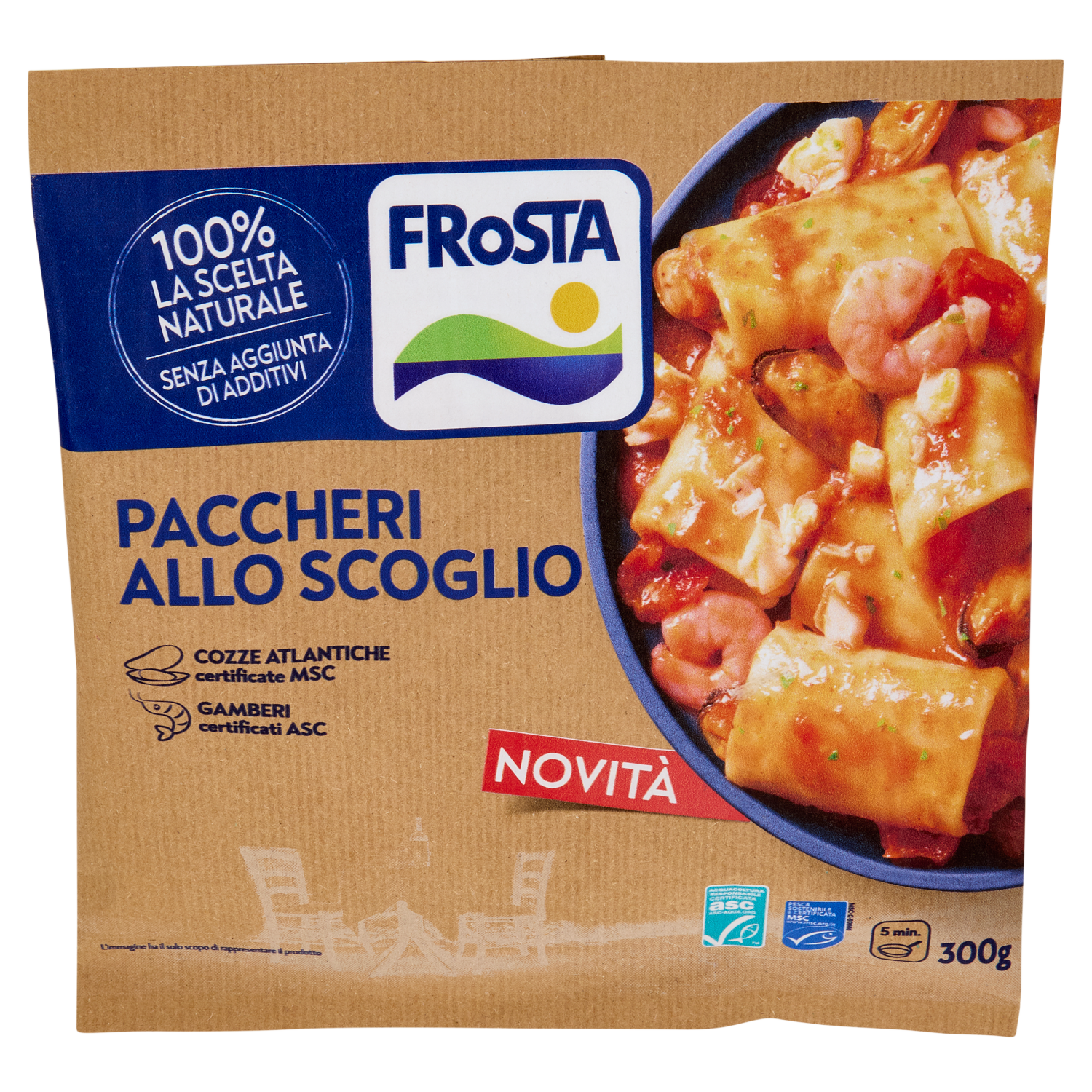 Questo è tutto - I nostri ingredienti: Pasta cotta (43%) (pasta di semola di grano duro, acqua) Acqua Pomodori Ciliegino - maturati al sole Filetti di merluzzo d'Alaska (9%) - da pesca sostenibile certificata MSC Cozze atlantiche sgusciate glassate (8%) (cozze atlantiche, acqua) - certificate MSC Mazzancolla indopacifica e Gambero indopacifico glassato (6%) (mazzancolla indopacifica e gambero indopacifico, acqua, sale) - certificati ASC Concentrato di pomodoro - preparato con pomodori coltivati all' aperto Olio di semi di girasole Olio extravergine di oliva - estratto a freddo Sale - senza aggiunta di antiagglomeranti Prezzemolo - surgelato subito dopo la raccolta Amido di riso Amido di patata Brodo di crostacei (0,3%) (acqua, gamberetto boreale, pomodori, carote, sale) - certificato MSC Aglio - tritato fresco da spicchi interi in FRoSTA Pepe nero - macinato in FRoSTA a partire dai grani FRoSTA - Solo Ingredienti Semplici e Naturali come quelli che useresti tu. La nostra missione è portare sulla tua tavola il sapore autentico della natura, garantendo un'alimentazione varia e gustosa per te e la tua famiglia. Dal 2003, noi di FRoSTA, facciamo a meno degli additivi aggiunti utilizzando solo ingredienti di qualità. Gusto senza compromessi I nostri Paccheri allo scoglio sono pronti in pochi minuti e preparati con ingredienti 100% la scelta naturale, senza additivi aggiunti. Con tutto il sapore autentico di una ricetta ispirata al mare, offrono un equilibrio perfetto tra semplicità e gusto. Il nostro impegno per il pianeta si riflette anche nel packaging: una busta in carta riciclabile FSC, per un piacere che rispetta anche l'ambiente.