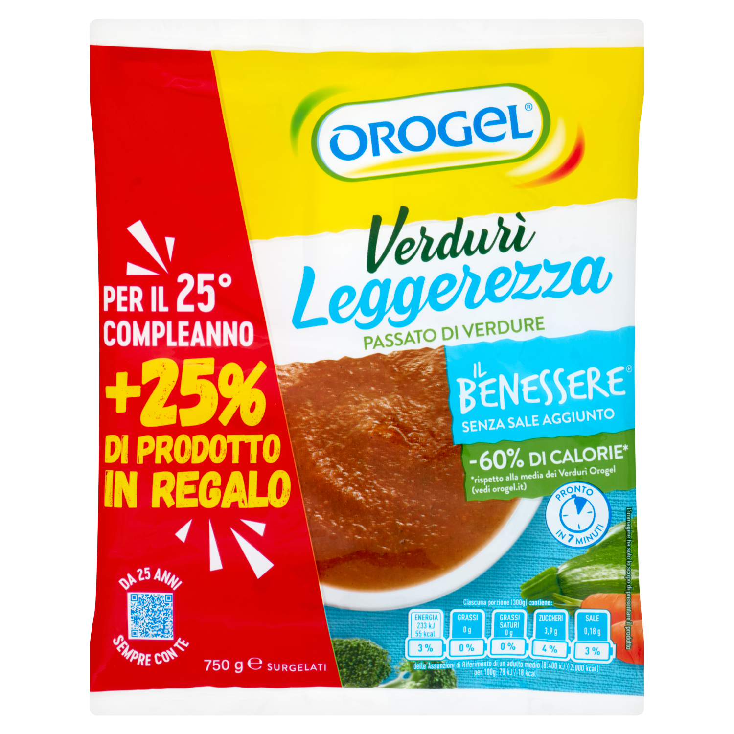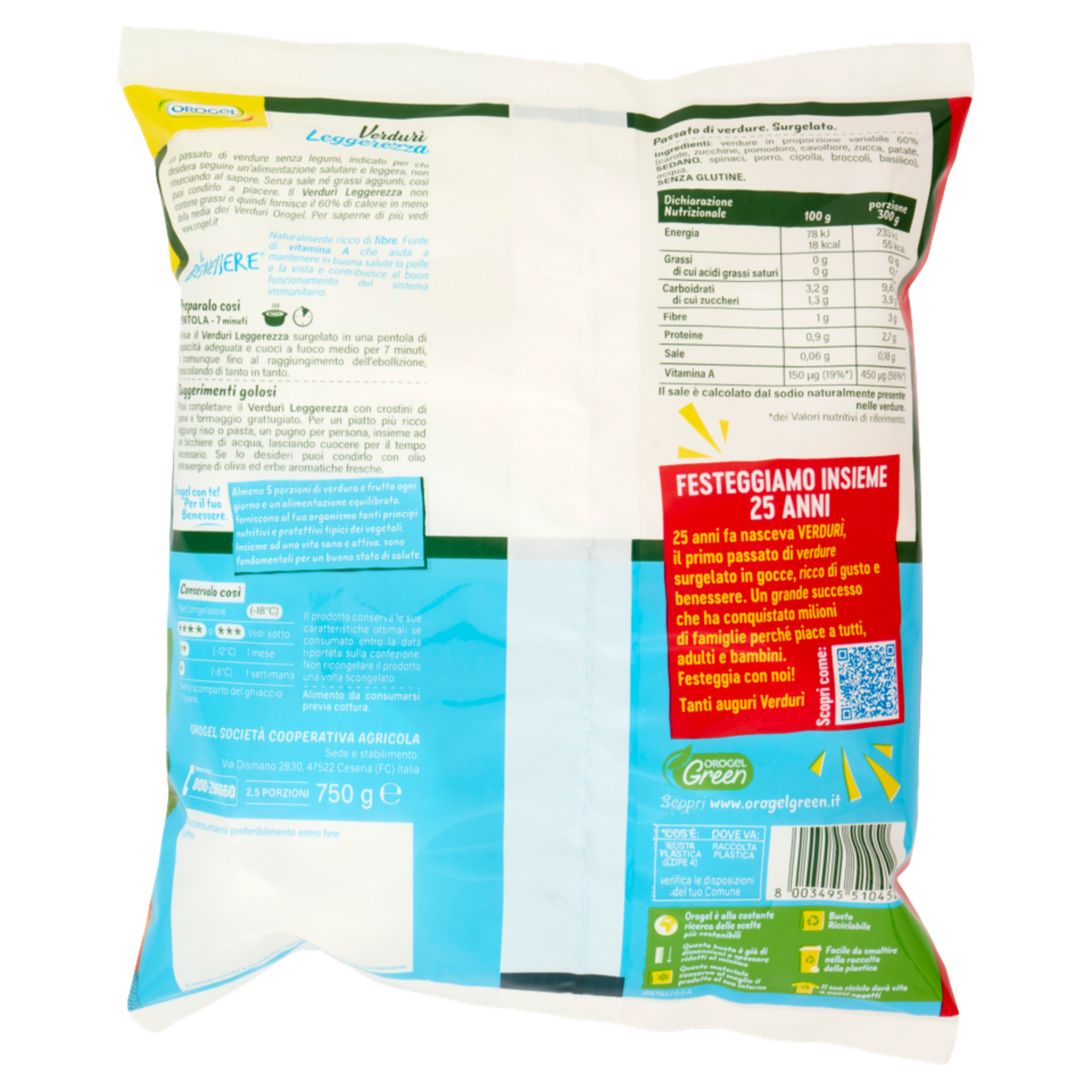 Un passato di verdure senza legumi, indicato per chi desidera seguire un'alimentazione salutare e leggera, non rinunciando al sapore. Senza sale né grassi aggiunti, così puoi condirlo a piacere. Il Verdurì Leggerezza non contiene grassi e quindi fornisce il 60% di calorie in meno della media dei Verdurì Orogel. Per saperne di più vedi www. orogel.it Naturalmente ricco di fibre. Fonte di vitamina A che aiuta a mantenere in buona salute la pelle e la vista e contribuisce al buon funzionamento immunitario. Orogel con te! Per il tuo Benessere. Almeno 5 porzioni di verdura e frutta ogni giorno e un'alimentazione equilibrata, forniscono al tuo organismo tanti principi nutritivi e protettivi tipici dei vegetali. Insieme ad una vita sana e attiva, sono fondamentali per un buono stato di salute. Orogel è alla costante ricerca delle scelte più sostenibili Questa busta è già di dimensioni e spessore ridotti al minimo Questo materiale conserva al meglio il prodotto al suo interno Busta Riciclabile Facile da smaltire nella raccolta della plastica Il suo riciclo darà vita a nuovi oggetti