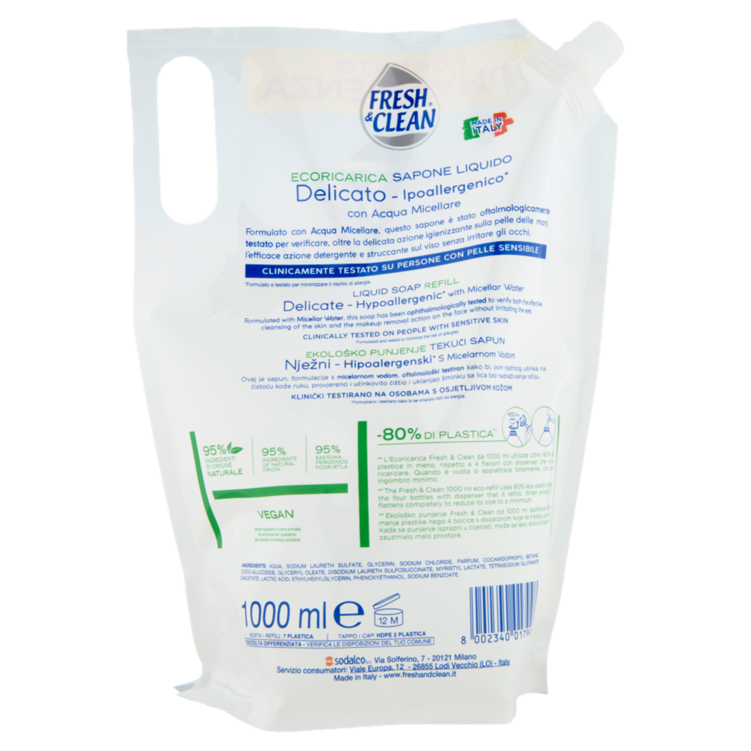 Fresh & Clean Sapone Liquido Delicato Ipoallergenico* con Acqua Micellare Ecoricarica 1000 ml