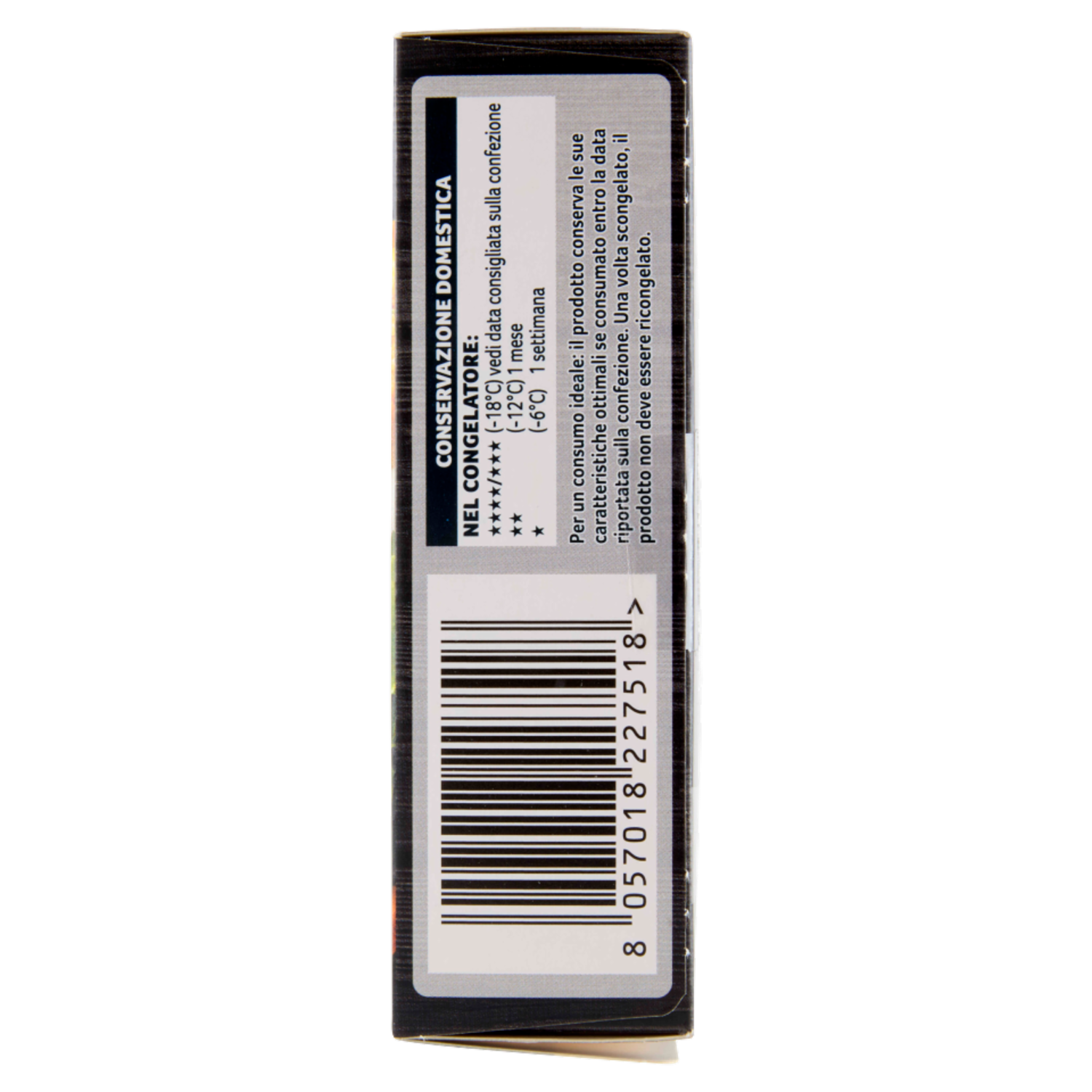 Conservazione domestica Nel congelatore: ****/*** (-18°C) vedi data consigliata sulla confezione ** (-12°C) 1 mese * (-6°C) 1 settimana Per un consumo ideale: il prodotto conserva le sue caratteristiche ottimali se consumato entro la data riportata sulla confezione. Una volta scongelato, il prodotto non deve essere ricongelato.
