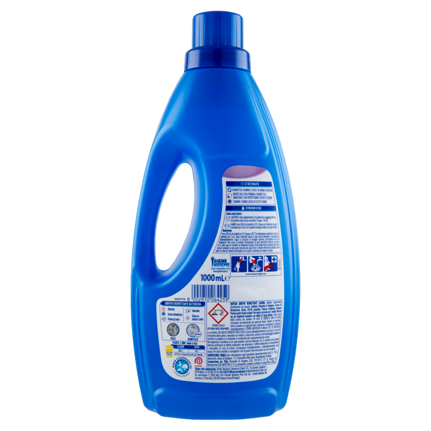 PERICOLO UFI: RH93-80SC-100H-N8D8 Napisan additivo disinfettante lavanda. Additivo smacchiate disinfettante per bucato. Contiene: Perossido di Idrogeno, Cloruro di Benzalconio, Alcoli, C10-16, etossilati. Provoca irritazione cutanea. Provoca gravi lesioni oculari. Può essere corrosivo per i metalli. Nocivo per gli organismi acquatici con effetti di lunga durata. Tenere fuori dalla portata dei bambini. IN CASO DI CONTATTO CON GLI OCCHI: sciacquare accuratamente per parecchi minuti. Togliere le eventuali lenti a contatto se è agevole farlo. Continuare a sciacquare. Contattare immediatamente il CENTRO ANTIVELENI di Milano (Tel. 02 66101029) o un medico. IN CASO CONTATTO CON LA PELLE: lavare abbondantemente con acqua. In caso di irritazione della pelle: consultare un medico. Conservare soltanto nell'imballaggio originale. Smaltire il prodotto e il recipiente in conformità alla regolamentazione locale. Non applicare il prodotto su un capo quando è ancora indossato. Se, in contatto con la pelle, dovesse verificarsi un effetto schiarente, non allarmarsi. L'effetto sbiancante è momentaneo e reversibile. In caso di schizzi, risciacquare immediatamente e abbondantemente con acqua. Per pelli sensibili è consigliato l'uso di guanti. Non mescolare con altri prodotti. A.I.S.E. www.cleanright.eu