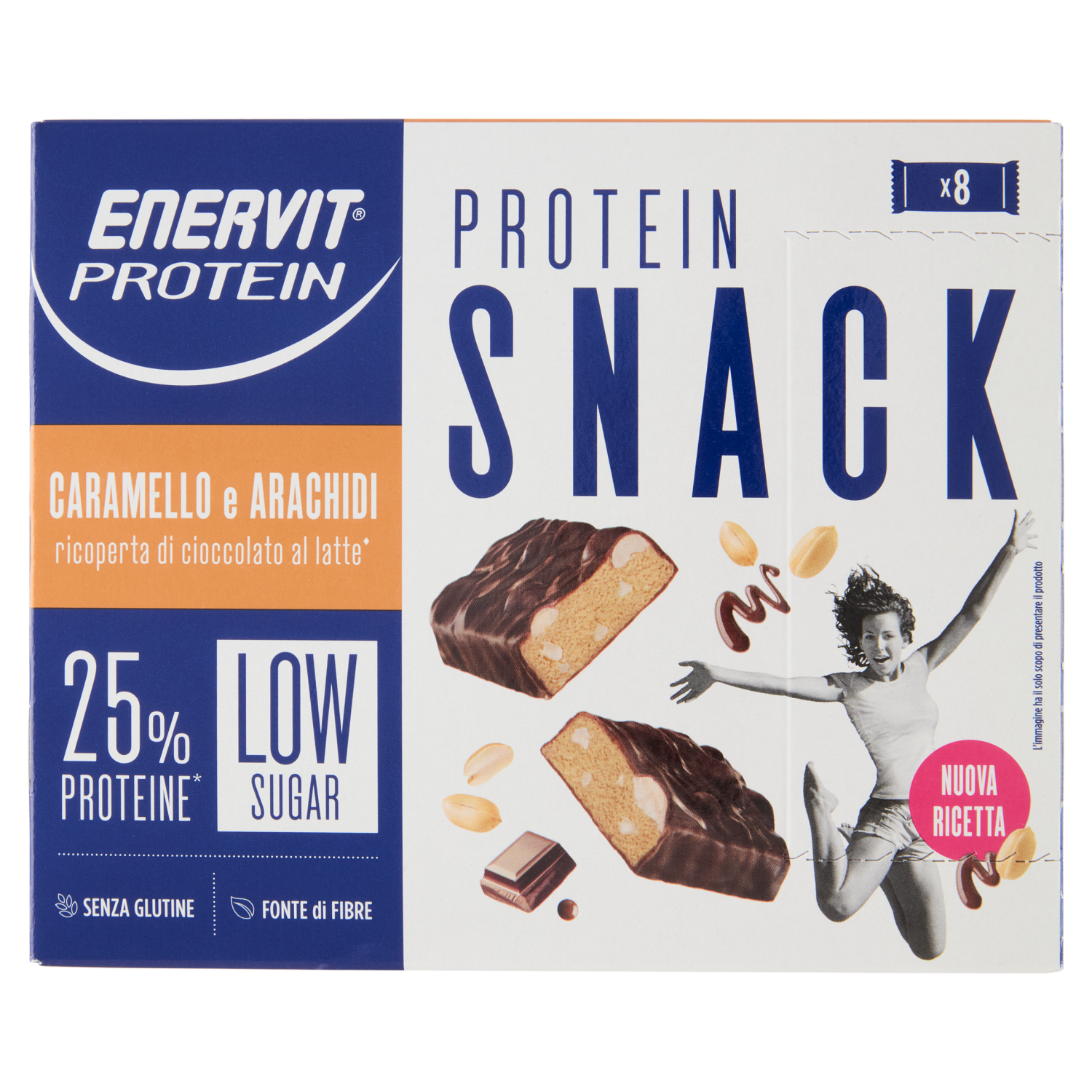 Enervit protein snack Barretta con proteine. Ricoperta di *cioccolato al latte con edulcorante. Senza glutine. Gusto caramello e arachidi A basso contenuto di zuccheri. Con edulcorante