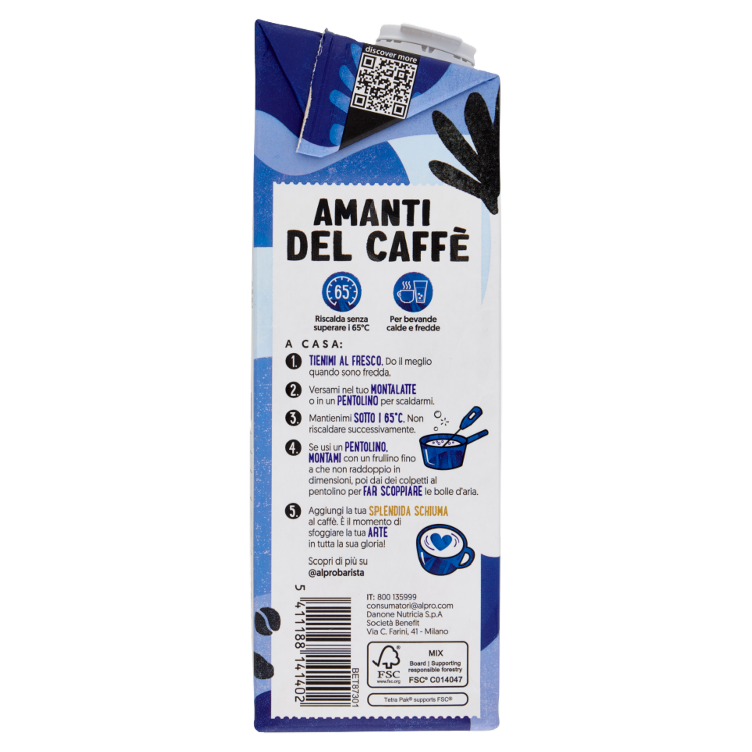 Agitare bene. Può essere utilizzata calda e fredda, in tutte le preparazioni al caffè. Amanti del caffè Riscalda senza superare i 65°C Per bevande - calde e fredde A casa: 1. Tienimi al fresco. Do il meglio quando sono fredda. 2. Versami nel tuo montalatte o in un pentolino per scaldarmi. 3. Mantienimi sotto i 65°C. Non riscaldare successivamente. 4 Se usi un pentolino. Montami con un frullino fino a che non raddoppio in dimensioni, poi dai dei colpetti al pentolino per far scoppiare le bolle d'aria. 5. Aggiungi la tua splendida schiuma al caffè. È il momento di sfoggiare la tua arte in tutta la sua gloria! Scopri di più su @alprobarista
