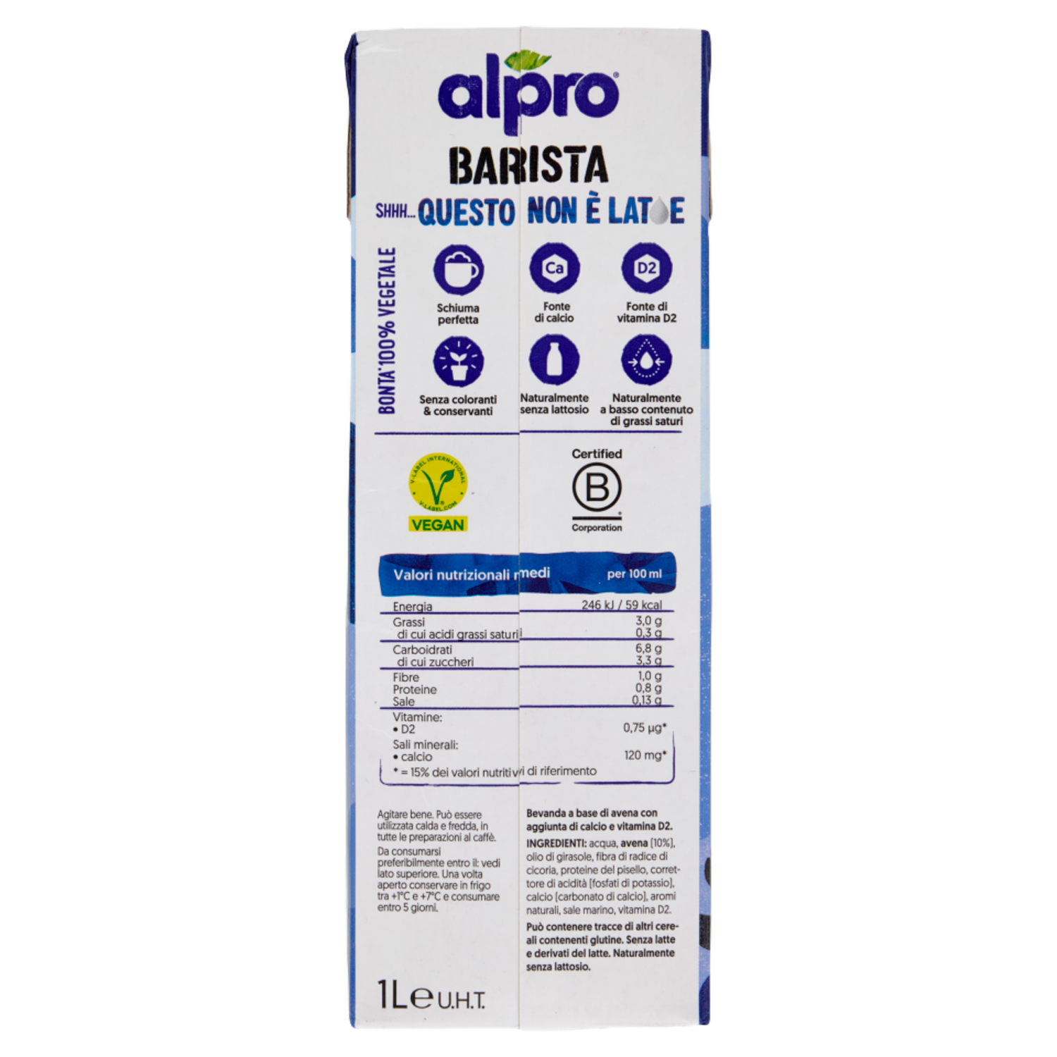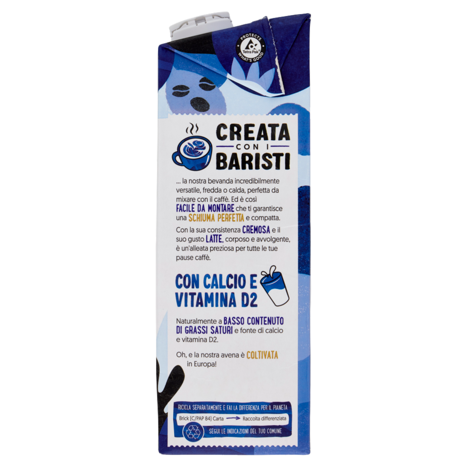 Bontà 100% vegetale Schiuma perfetta Fonte di calcio Fonte di vitamina D2 Senza coloranti & conservanti Naturalmente senza lattosio Naturalmente a basso contenuto di grassi saturi Creata con i baristi ... la nostra bevanda incredibilmente versatile, fredda o calda, perfetta da mixare con il caffè. Ed è così Facile da Montare che ti garantisce una Schiuma Perfetta e compatta. Con la sua consistenza Cremosa e il suo gusto Latte, corposo e avvolgente, è un'alleata preziosa per tutte le tue pause caffè. Con calcio e vitamina D2 Naturalmente a Basso Contenuto di Grassi Saturi e fonte di calcio e vitamina D2. Oh, e la nostra avena è Coltivata in Europa!