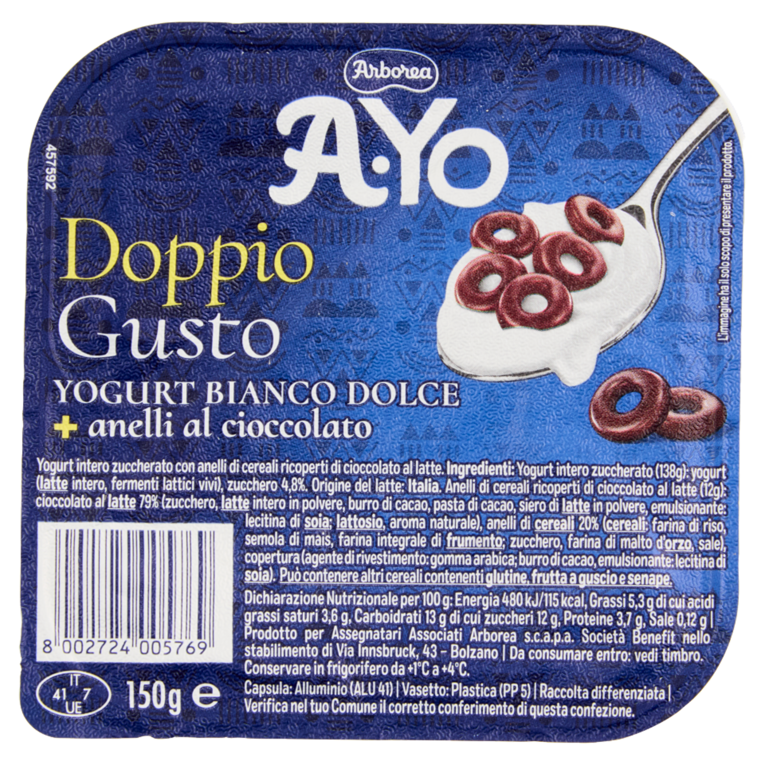 Arborea A-Yo Doppio Gusto Yogurt Bianco Dolce + anelli al cioccolato 150 g