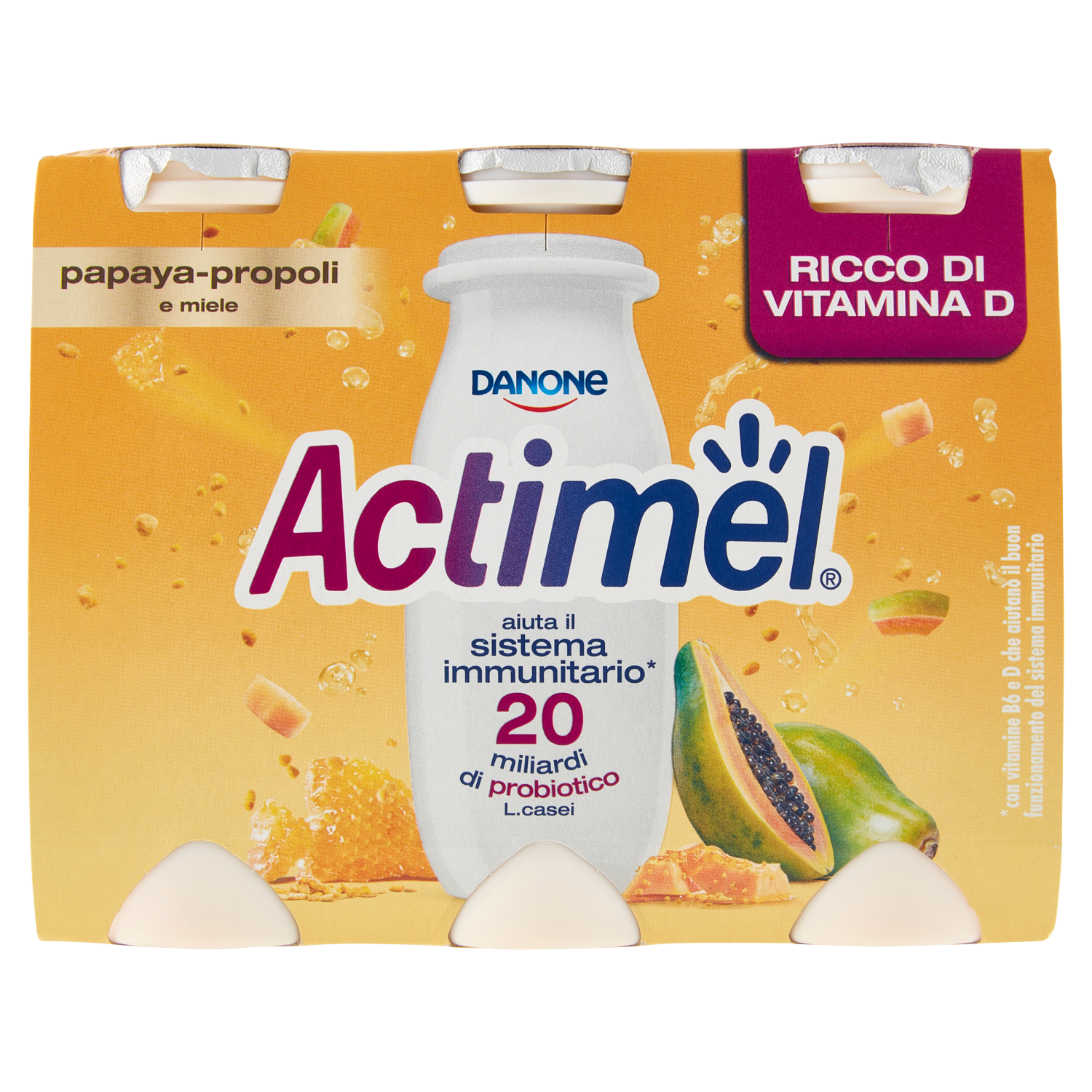 Fortedentro A volte la vita ci mette alla prova. Affrontiamola insieme! Sono Actimel, il tuo rinforzo quotidiano e da oggi sono ancora più forte dentro grazie ad una nuova formula arricchita! Oltre ai miei 20 miliardi di probiotico L.casei e la vitamina B6, da oggi sono ricco di vitamina D, per darti 1/3 dei valori nutritivi di riferimento in ogni bottiglietta. Non sottovalutarmi: sono piccolo fuori, ma forte dentro! - Con probiotico L.casei - Con vitamina B6 - Con 1/3 VNR*** di vitamina D - Senza coloranti & conservanti - Senza glutine - Carta e bottiglietta riciclabili Gustalo nell'ambito di una dieta varia ed equilibrata e di uno stile di vita sano. Ogni bottiglietta contiene il 33% dei VNR*** della vit. D e il 15% dei VNR*** della vit. B6. ***VNR= Valori Nutritivi di Riferimento